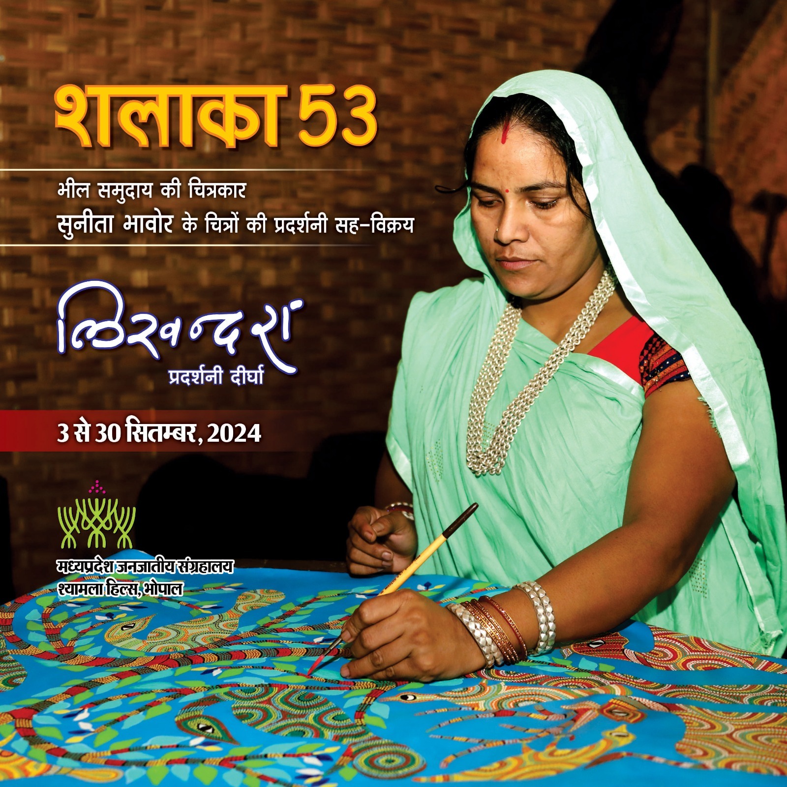 शलाका 53 भील समुदाय की चित्रकार सुनीता भावोर के चित्रों की प्रदर्शनी सह-विक्रय लिखन्दरा प्रदर्शनी दीर्घा 3 से 30 सितम्बर, 2024 मध्यप्रदेश जनजातीय संग्रहालय श्यामला हिल्स, भोपाल