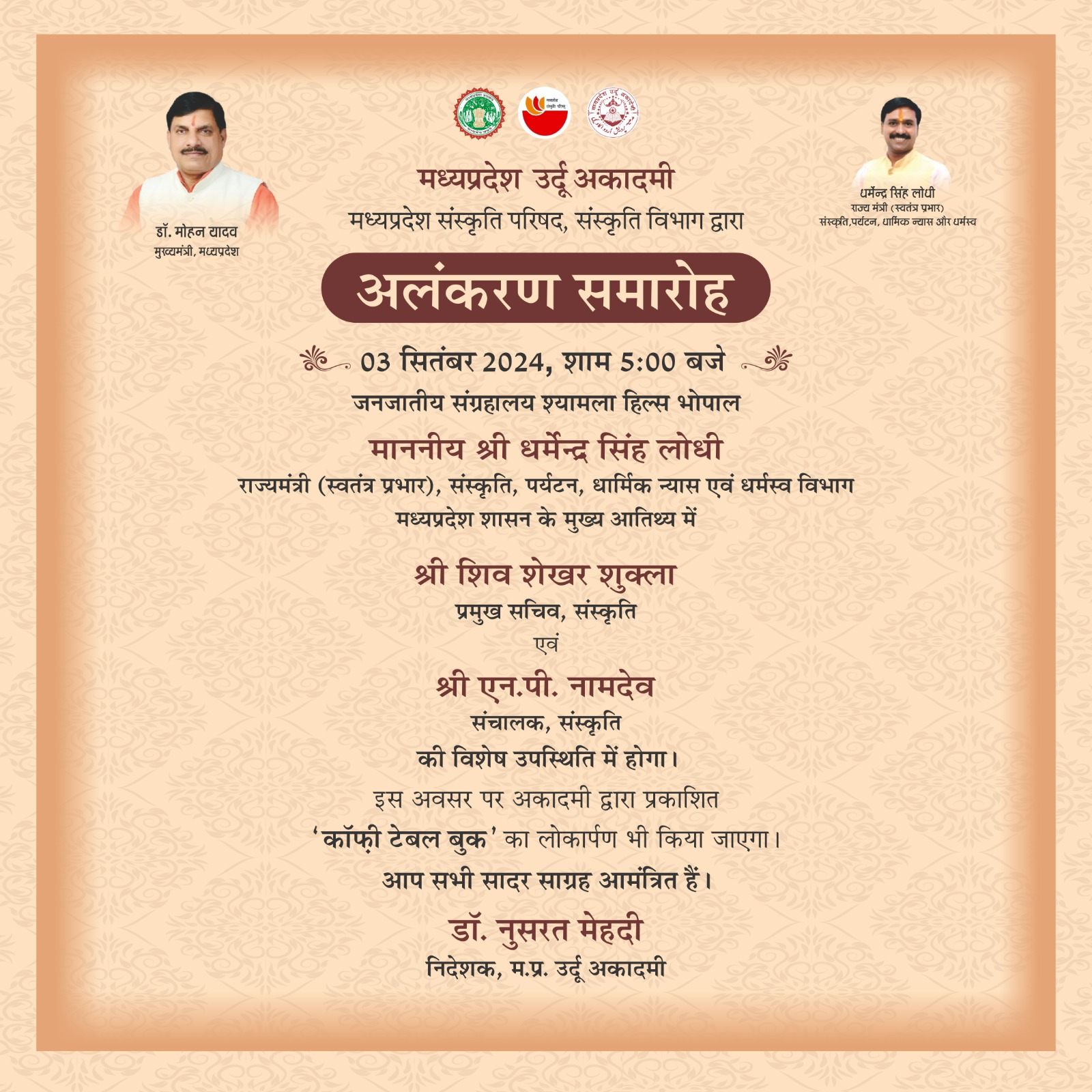 #Taqreeb_E_Aizazaat #MpUrduAcademey #mpculturedeptt "मध्यप्रदेश उर्दू अकादमी द्वारा अलंकरण समारोह 3 सितंबर को जनजातीय संग्रहालय में" संस्कृति एवं पर्यटन मंत्री श्री धर्मेंद्र भाव सिंह लोधी के मुख्य आतिथ्य में होगा कार्यक्रम" मध्य प्रदेश उर्दू अकादमी मध्यप्रदेश संस्कृति परिषद, संस्कृति विभाग द्वारा अलंकरण समारोह कार्यक्रम 3 सितंबर, 2024 को सायं 5:00 बजे जनजातीय संग्रहालय, श्यामला हिल्स, भोपाल में मान. श्री धर्मेंद्र भाव सिंह लोधी मंत्री-संस्कृति, पर्यटन, धार्मिक एवं धर्मस्व मध्यप्रदेश शासन के मुख्य आतिथ्य में एवं श्री शिव शेखर शुक्ला प्रमुख सचिव-संस्कृति एवं पर्यटन विभाग तथा श्री एनलपी नामदेव संचालक संस्कृति की विशेष उपस्थिति में आयोजित होगा। उर्दू अकादमी की निदेशक डॉ नुसरत मेहदी ने कार्यक्रम के बारे में जानकारी देते हुए कहा कि संस्कृति विभाग की अन्य अकादमियों के समान मध्यप्रदेश उर्दू अकादमी द्वारा भी उर्दू भाषा एवं साहित्य से संबंधित विभिन्न विधाओं पर आधारित प्रकाशित पुस्तकों पर अखिल भारतीय एवं प्रादेशिक पुरस्कार दिये जाने का सिलसिला वर्ष 2021 से शुरू किया गया है। इसका उद्देश्य उर्दू साहित्य की लुप्त होती हुई अनेक विधाओं पर कार्य करने हेतु रचनाकारों का ध्यान आकर्षित करना एवं उन्हें प्रोत्साहित करना है। इस वर्ष मध्य प्रदेश उर्दू अकादमी द्वारा तीन रचनाकारों को उनकी कृतियों पर अखिल भारतीय पुरस्कार एवं 11 रचनाकारों को प्रादेशिक पुरस्कार से 3 सितंबर 2024 को माननीय संस्कृति मंत्री जी के हाथों सम्मानित किया जाएगा। ------------------------------------------
