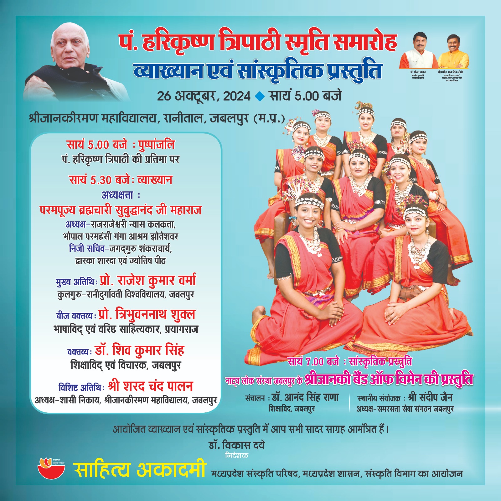 साहित्य अकादमी, मध्यप्रदेश संस्कृति परिषद्, मध्यप्रदेश शासन संस्कृति विभाग भोपाल द्वारा पं. हरिकृष्ण त्रिपाठी की स्मृति समारोह में दिनांक 26 अक्टूबर, 2024 को सायं 5.00 बजे से श्रीजानकीरमण महाविद्यालय, रानीताल, जबलपुर (म.प्र.) में व्याख्यान एवं सांस्कृतिक प्रस्तुति आयोजित है। कार्यक्रम के प्रथम सत्र में सायं 5.00 बजे पुष्पांजलि का कार्यक्रम है। कार्यक्रम के द्वितीय सत्र सायं 5.30 बजे व्याख्यान की अध्यक्षता परमपूज्य ब्रह्मचारी सुबुद्धानंद जी महाराज करेंगे। मुख्य अतिथि प्रो. राजेश कुमार वर्मा-कुलगुरु रानीदुर्गावती विश्वविद्यालय-जबलपुर होंगे। बीज वक्तव्य प्रो. त्रिभुवननाथ शुक्ल-प्रयागराज एवं वक्तव्य डॉ. शिव कुमार सिंह-जबलपुर देंगे। विशिष्ट अतिथि के रूप में श्री शरद चंद पालन-जबलपुर होंगे। कार्यक्रम के तृतीय सत्र में सायं 7.00 बजे नाट्य लोक संस्था जबलपुर के श्रीजानकी बैंड ऑफ विमेन द्वारा विभिन्न सांस्कृतिक प्रस्तुति होंगी। इस पूरे कार्यक्रम का संचालन इतिहासविद डॉ. आनंद सिंह राणा करेंगे। कार्यक्रम के स्थानीय संयोजक श्री संदीप जैन हैं। आयोजित व्याख्यान एवं सांस्कृतिक प्रस्तुति में आप सभी सादर साग्रह आमंत्रित हैं। डॉ. विकास दवे निदेशक साहित्य आदमी, भोपाल