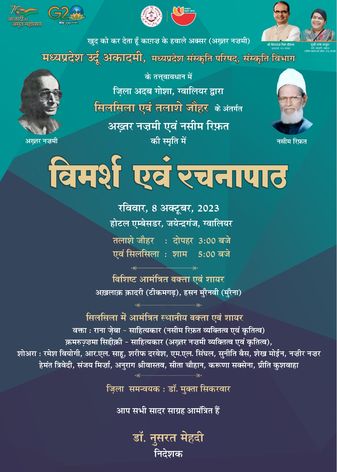 खुद को कर देता हूँ काग़ज़ के हवाले अक्सर (अख़्तर नज़मी) मध्यप्रदेश उर्दू अकादमी, मध्यप्रदेश संस्कृति परिषद, संस्कृति विभाग के तत्त्वावधान में जिला अदब गोशा, ग्वालियर द्वारा सिलसिला एवं तलाशे जौहर के अंतर्गत अख़्तर नज़मी एवं नसीम रिफ़त की स्मृति में विमर्श एवं रचनापाठ रविवार, 8 अक्टूबर, 2023 होटल एम्बेसडर, जयेन्द्रगंज, ग्वालियर तलाशे जौहर : दोपहर 3:00 बजे एवं सिलसिला : शाम 5:00 बजे विशिष्ट आमंत्रित वक्ता एवं शायर अख़लाक़ क़ादरी (टीकमगढ़), हसन मुरैनवी (मुरैना) सिलसिला में आमंत्रित स्थानीय वक्ता एवं शायर वक्ता : राना ज़ेबा - साहित्यकार (नसीम रिफ़त व्यक्तित्व एवं कृतित्व) क़मरुज्ज़मा सिद्दीक़ी साहित्यकार (अख़्तर नजमी व्यक्तित्व एवं कृतित्व), शोअरा: रमेश वियोगी, आर. एल. साहू, शरीफ दरवेश, एम. एल. सिंघल, सुनीति बैस, शेख मोईन, नज़ीर नज़र हेमंत त्रिवेदी, संजय मिर्ज़ा, अनुराग श्रीवास्तव, सीता चौहान, करूणा सक्सेना, प्रीति कुशवाहा जिला समन्वयक : डॉ. मुक्ता सिकरवार आप सभी सादर साग्रह आमंत्रित हैं डॉ. नुसरत मेहदी निदेशक