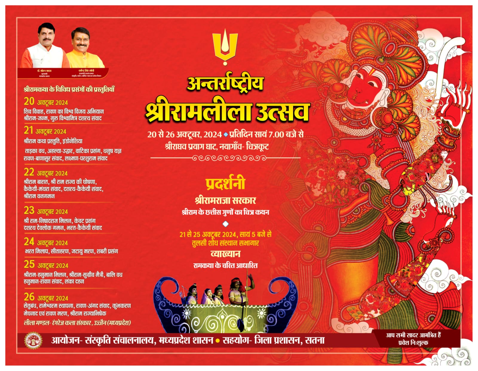 अन्तर्राष्ट्रीय श्रीरामलीला उत्सव 20 से 26 अक्टूबर, 2024 प्रतिदिन सायं 7.00 बजे से श्रीराघव प्रयाग घाट, नयागाँव- चित्रकूट प्रदर्शनी - श्रीरामराजा सरकार श्रीराम के छत्तीस गुणों का चित्र कथन आयोजन - संस्कृति संचालनालय, मध्यप्रदेश शासन सहयोग- जिला प्रशासन, सतना