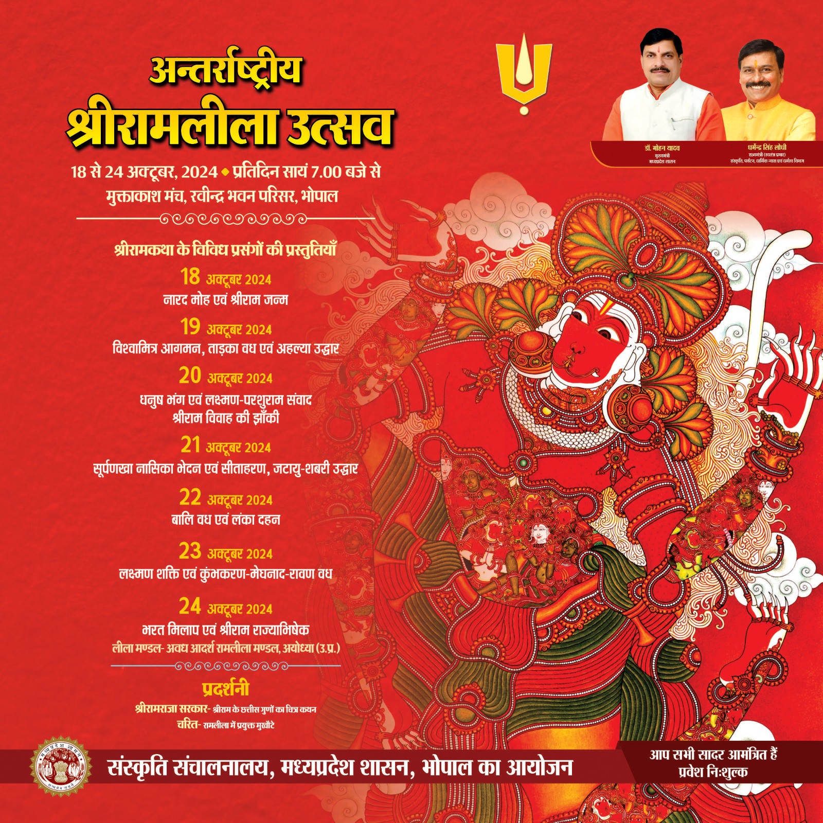 श्रीरामलीला उत्सव 18 से 24 अक्टूबर, 2024 प्रतिदिन सायं 7.00 बजे से मुक्ताकाश मंच, रवीन्द्र भवन परिसर, भोपाल लीला मण्डल-अवध आदर्श रामलीला मण्डल, अयोध्या (उ.प्र.) प्रदर्शनी श्रीरामराजा सरकार- श्रीराम के छत्तीस गुणों का चित्र कथन “वनवासी श्रीराम” वनगमन पथ के महत्त्वपूर्ण स्थलों का चित्रांकन चरित- रामलीला में प्रयुक्त मुखोटे संस्कृति संचालनालय, मध्यप्रदेश शासन, भोपाल का आयोजन