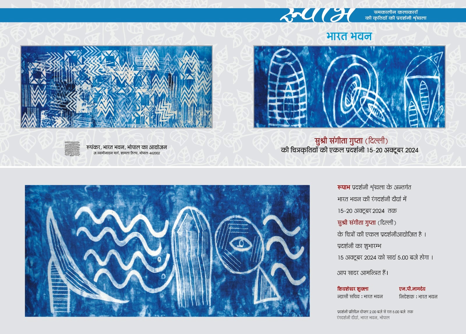 रूपाभ प्रदर्शनी श्रृंखला के अन्तर्गत भारत भवन की रंगदर्शनी दीर्घा में 15-20 अक्टूबर 2024 तक सुश्री संगीता गुप्ता (दिल्ली) के चित्रों की एकल प्रदर्शनी आयोजित है । प्रदर्शनी का शुभारम्भ 15 अक्टूबर 2024 को सायं 5.00 बजे होगा । आप सादर आमन्त्रित हैं। प्रदर्शनी प्रतिदिन दोपहर 2.00 बजे से रात 8.00 बजे तक रंगदर्शनी दीर्घा, भारत भवन, भोपाल