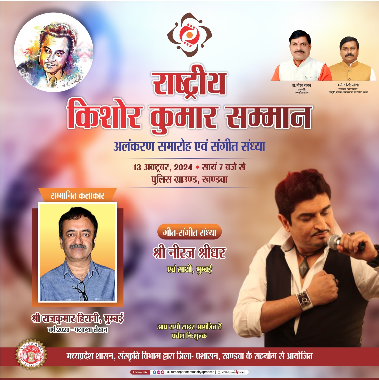 मध्यप्रदेश शासन, संस्कृति विभाग द्वारा जिला प्रशासन - खण्डवा के सहयोग से प्रतिवर्ष की भांति इस वर्ष भी महान गायक-कलाकार किशोर कुमार की पुण्यतिथि के अवसर पर 13 अक्टूबर, 2024 को राष्ट्रीय किशोर कुमार सम्मान अलंकरण समारोह एवं संगीत संध्या का आयोजन सायं 7 बजे से पुलिस ग्राउण्ड, खण्डवा में किया जा रहा है। राष्ट्रीय किशोर कुमार सम्मान वर्ष 2023 पटकथा लेखन के लिए सुप्रसिद्ध पटकथा लेखक और निर्माता-निर्देशक श्री राजकुमार हिरानी को अलंकृत किया जावेगा। संगीत संध्या का आयोजन किया जाएगा, जिसमें सुप्रसिद्ध गायक श्री नीरज श्रीधर प्रस्तुति देंगे। कार्यक्रम में प्रवेश नि:शुल्क रहेगा।