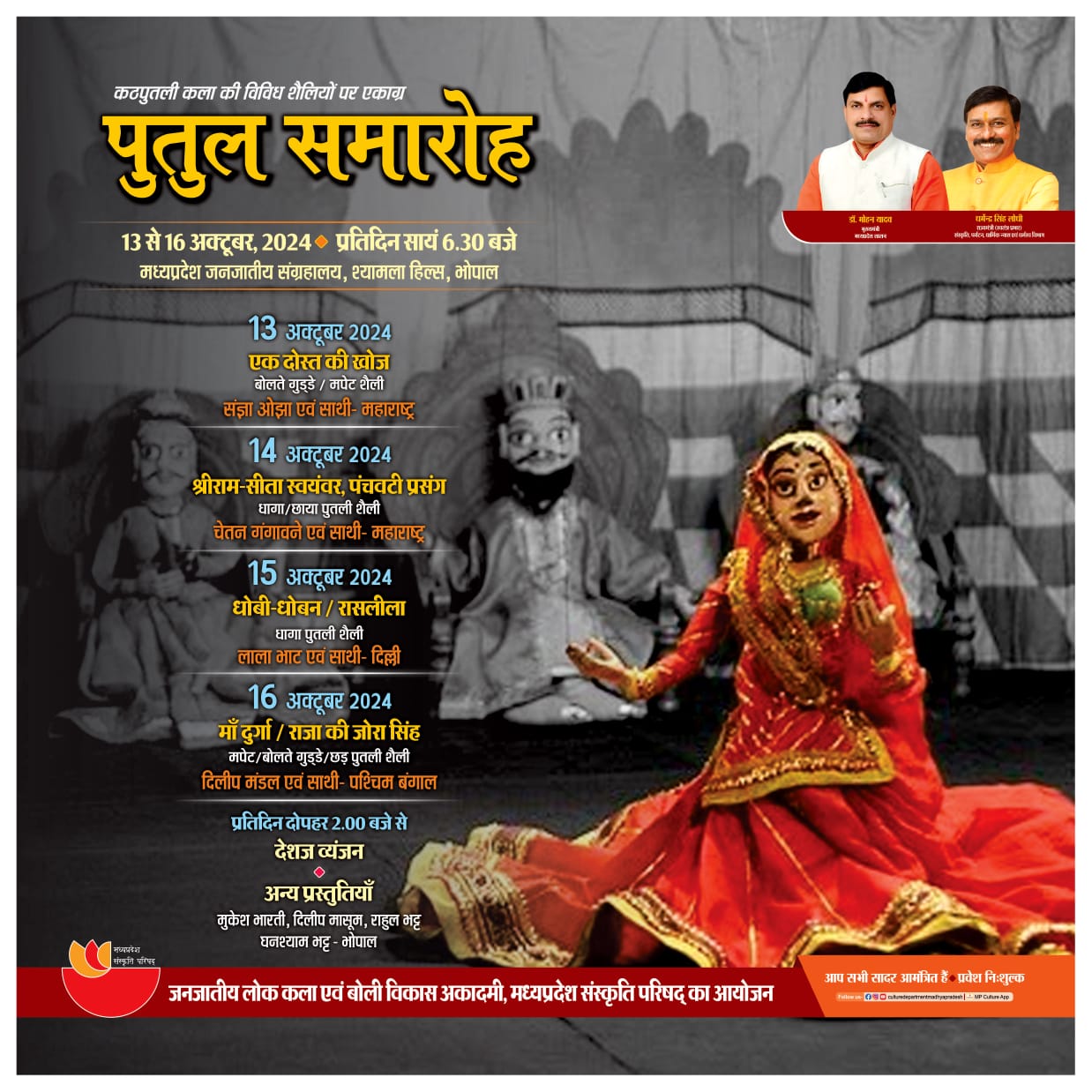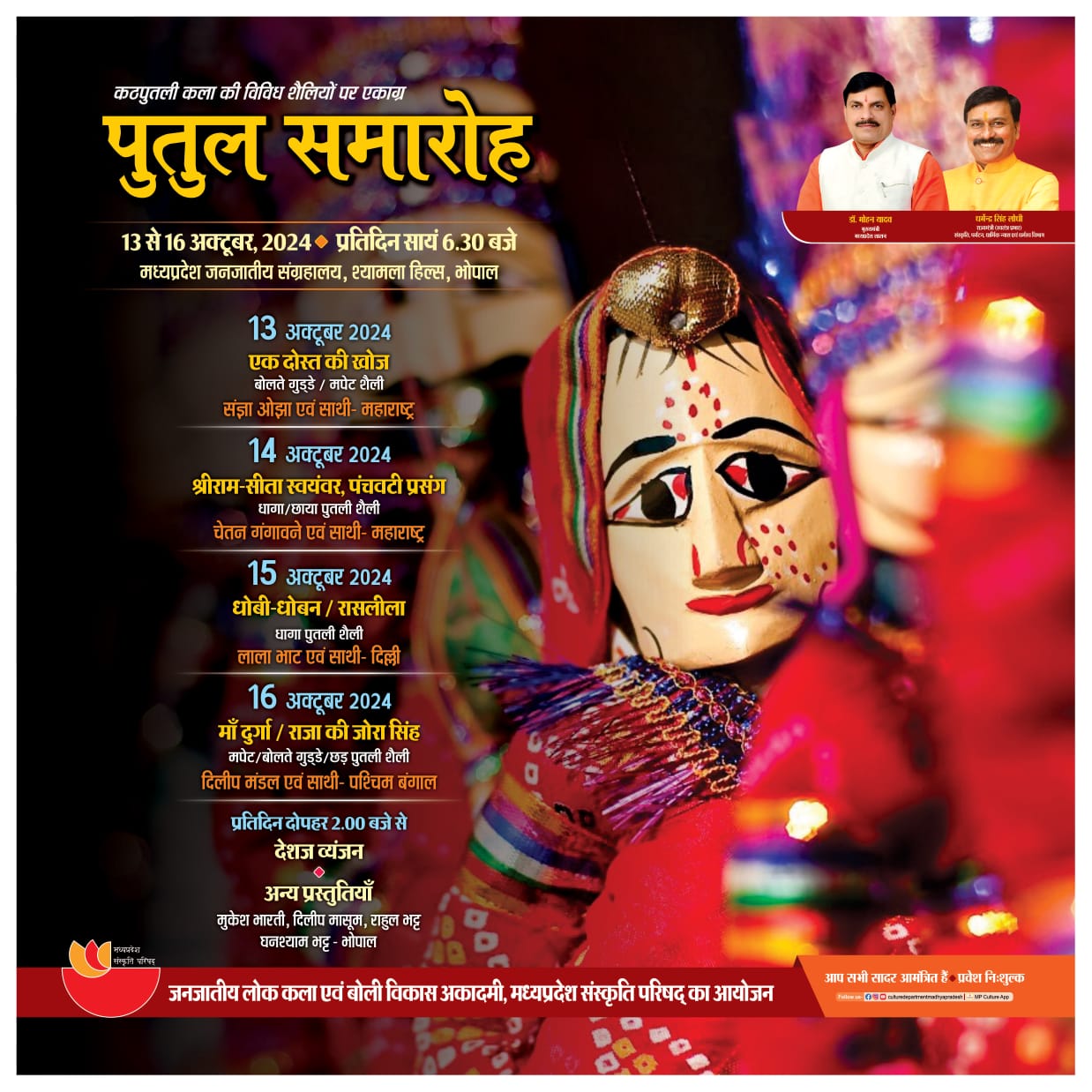 कठपुतली कला की विविध शैलियों पर एकाग्र पुतुल समारोह 13 से 16 अक्टूबर, 2024 प्रतिदिन सायं 6.30 बजे मध्यप्रदेश जनजातीय संग्रहालय, श्यामला हिल्स, भोपाल मध्यप्रदेश संस्कृति परिषद् आप सभी सादर आमंत्रित हैं प्रवेश निःशुल्क Follow us culturedepartmentmadhyapradesh MP Culture App जनजातीय लोक कला एवं बोली विकास अकादमी, मध्यप्रदेश संस्कृति परिषद् का आयोजन