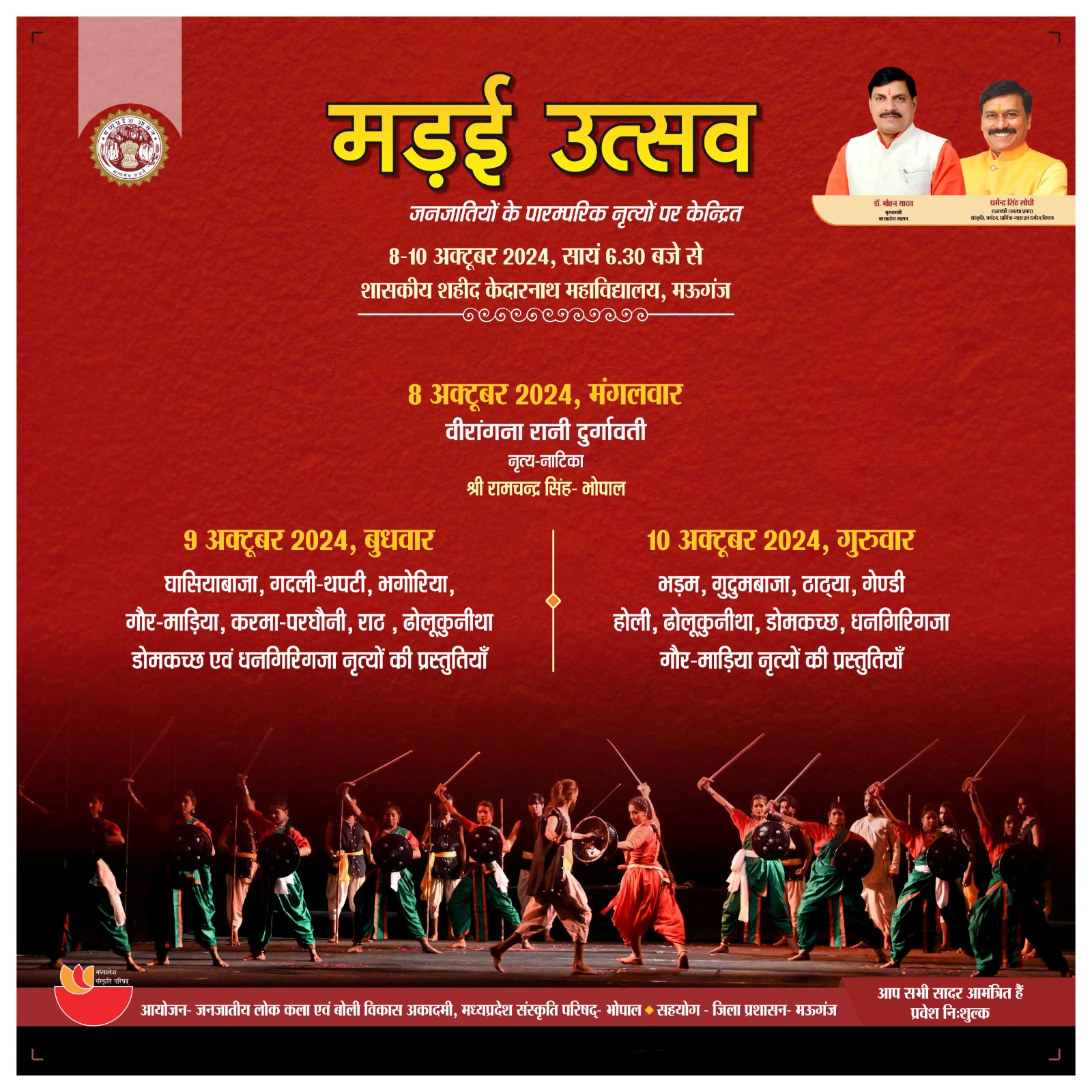 मड़ई उत्सव जनजातियों के पारम्परिक नृत्यों पर केन्द्रित 8-10 अक्टूबर 2024, सायं 6.30 बजे से शासकीय शहीद केदारनाथ महाविद्यालय, मऊगंज मध्यप्रदेश संस्कृति परिषद् आयोजन- जनजातीय लोक कला एवं बोली विकास अकादमी, मध्यप्रदेश संस्कृति परिषद्- भोपाल सहयोग - जिला प्रशासन- मऊगंज
