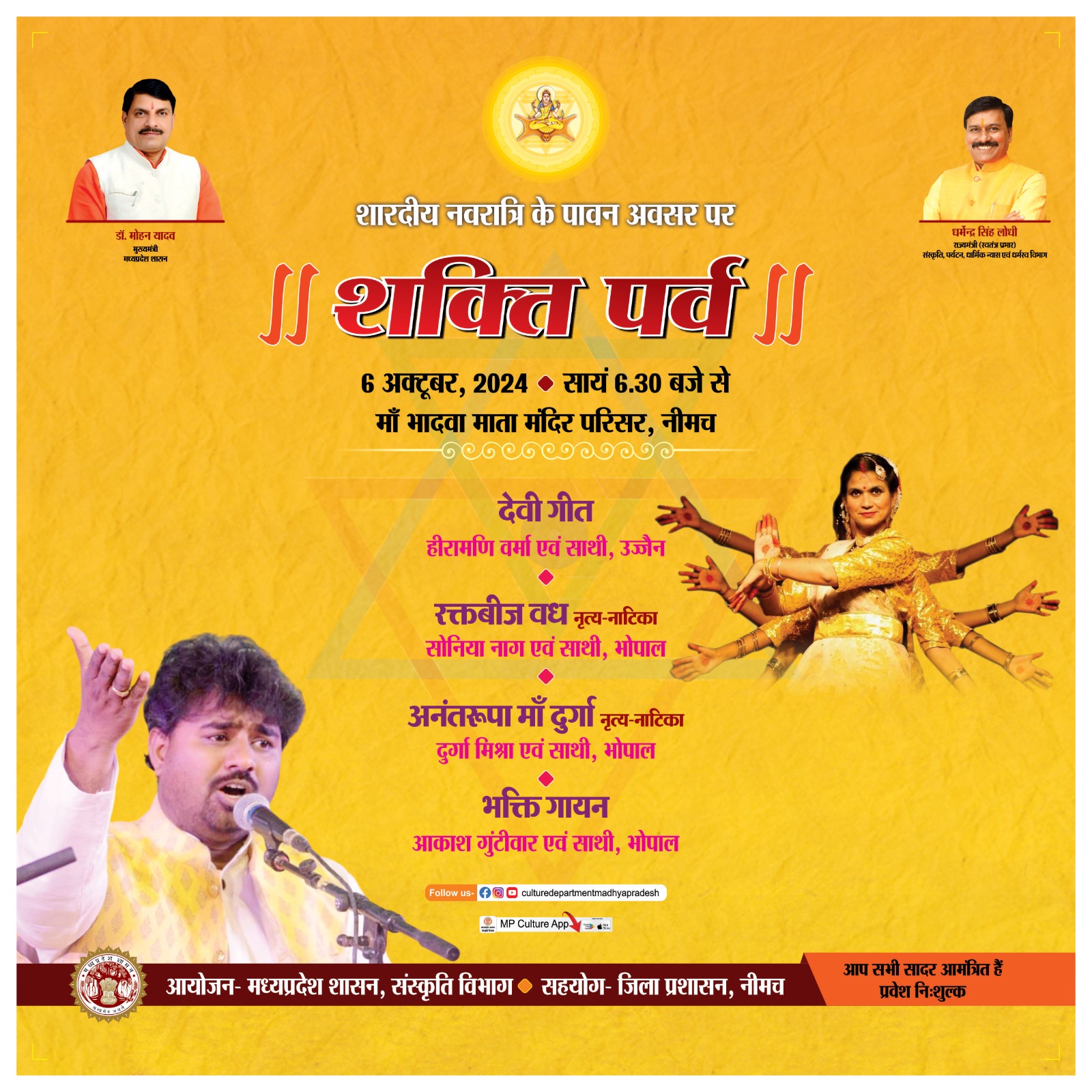 शारदीय नवरात्रि के पावन अवसर पर || शक्ति पर्व || 6 अक्टूबर, 2024 सायं 6.30 बजे से माँ भादवा माता मंदिर परिसर, नीमच आयोजन- मध्यप्रदेश शासन, संस्कृति विभाग सहयोग- जिला प्रशासन, नीमच