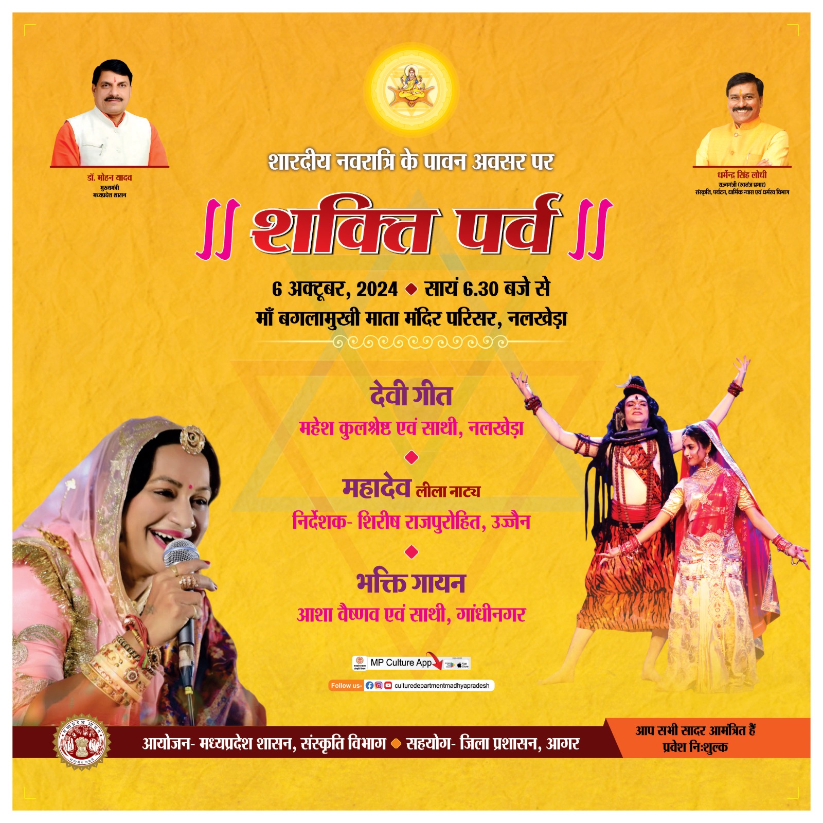 शारदीय नवरात्रि के पावन अवसर पर || शक्ति पर्व || 6 अक्टूबर, 2024 सायं 6.30 बजे से माँ भादवा माता मंदिर परिसर, नीमच आयोजन- मध्यप्रदेश शासन, संस्कृति विभाग सहयोग- जिला प्रशासन, नीमच