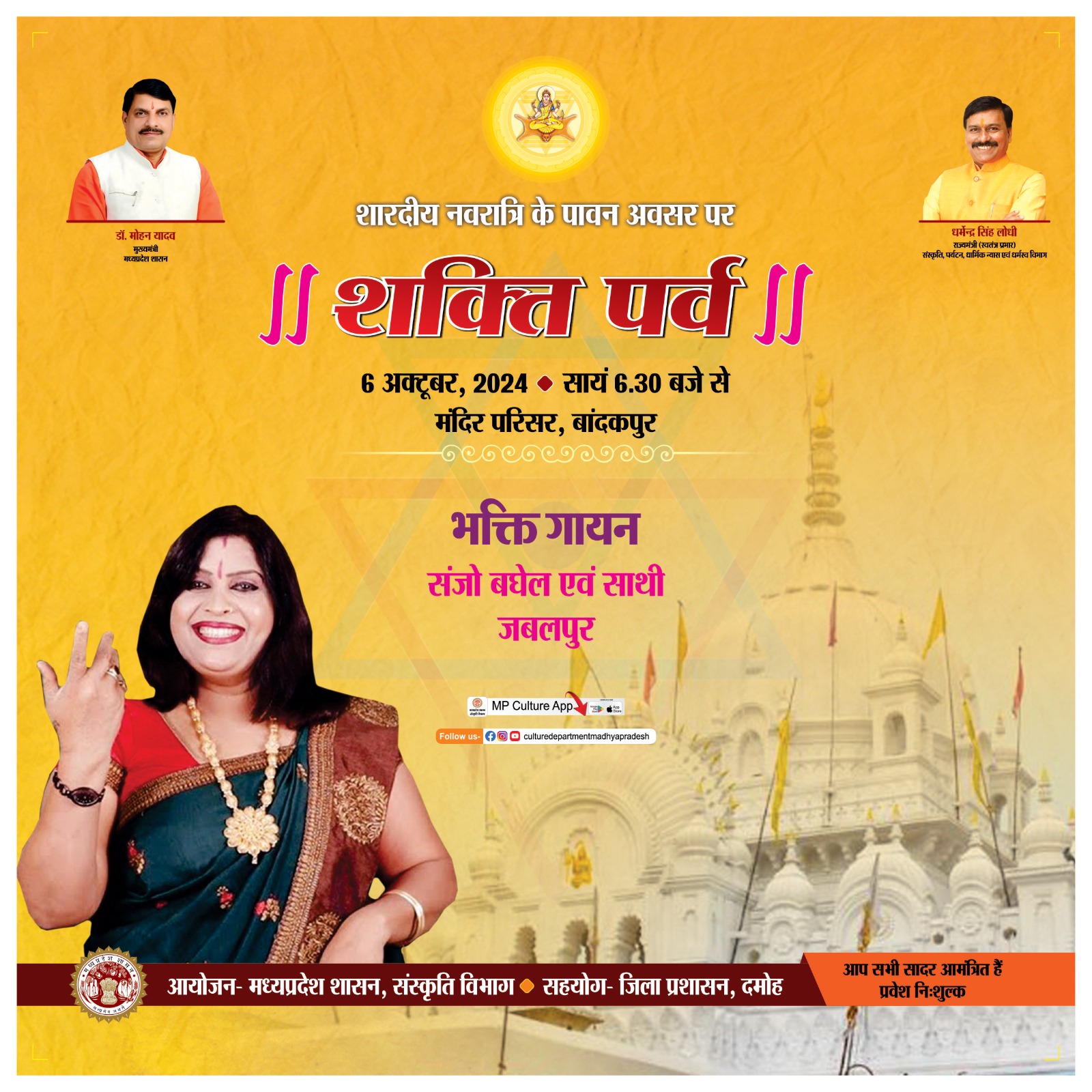 शारदीय नवरात्रि के पावन अवसर पर || शक्ति पर्व || 6 अक्टूबर, 2024 सायं 6.30 बजे से मंदिर परिसर, बांदकपुर आयोजन- मध्यप्रदेश शासन, संस्कृति विभाग सहयोग- जिला प्रशासन, दमोह
