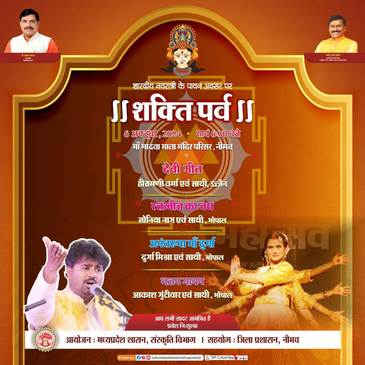 शारदीय नवरात्रि के पावन अवसर पर ।। शक्ति पर्व ।। 6 अक्टूबर, 2024 • सायं 6:30 बजे माँ भादवा माता मंदिर परिसर, नीमच देवी गीत हीरामणी वर्मा एवं साथी, उज्जैन रक्तबीज का वध सोनिया नाग एवं साथी, भोपाल अनंतरूपा माँ दुर्गा दुर्गा मिश्रा एवं साथी, भोपाल भजन गायन आकाश गुंटीवार एवं साथी, भोपाल आप सभी सादर आमंत्रित हैं प्रवेश निःशुल्क आयोजन : मध्यप्रदेश शासन, संस्कृति विभाग । सहयोग : जिला प्रशासन, नीमच