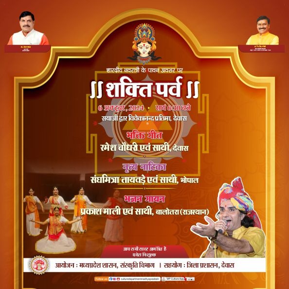 शारदीय नवरात्रि के पावन अवसर पर ।। शक्ति पर्व ।। 6 अक्टूबर, 2024- सायं 6.30 बजे सयाजी द्वार विवेकानन्द प्रतिमा, देवास भक्ति गीत रमेश चौधरी एवं साथी, देवास नृत्य नाटिका संघमित्रा तायवड़े एवं साथी, भोपाल भजन गायन प्रकाश माली एवं साथी, बालोतरा (राजस्थान ) आप सभी सादर आमंत्रित है प्रवेश निःशुल्क आयोजन : मध्यप्रदेश शासन, संस्कृति विभाग । सहयोग : जिला प्रशासन, देवास