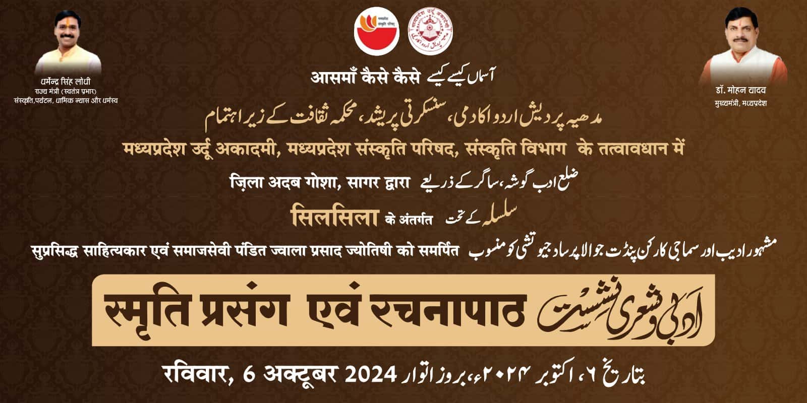 #Zila_Sagar #Silsila #MpUrduAcademey #mpculturedeptt आसमाँ कैसे कैसे मध्यप्रदेश उर्दू अकादमी, मध्यप्रदेश संस्कृति परिषद, संस्कृति विभाग के तत्वावधान में ज़िला अदब गोशा, सागर द्वारा सिलसिला के अंतर्गत सुप्रसिद्ध साहित्यकार एवं समाजसेवी पंडित ज्वाला प्रसाद ज्योतिषी को समर्पित स्मृति प्रसंग एवं रचनापाठ रविवार, 6 अक्टूबर 2024 होटल सिद्धिविनायक, सिविल लाईन्स, सागर सिलसिला : दोपहर 2:00 बजे विशिष्ट आमंत्रित वक्ता एवं शायर डॉ. मोहम्मद अनीस (सीहोर) सिलसिला में आमंत्रित स्थानीय वक्ता एवं शायर वक्ता :- आशीष ज्योतिषी साहित्यकार (विषय: पंडित ज्वाला प्रसाद ज्योतिषी व्यक्तित्व एवं कृतित्व) शायर :- वृन्दावन राय सरल, अरुण दुबे, मोहम्मद शरीफ, ईश्वर दयाल गोस्वामी अबरार अहमद, वरूण प्रधन, क्रांति जबलपुरी, शफ़ीक़ अनवर, प्रभात कटारे, भानु प्रताप सिंह, सुल्तान खान, मुकेश रहबर, आमीन अली, नईम माहिर ज़िला समन्वयक : आदर्श दुबे आप सभी सादर साग्रह आमंत्रित हैं डॉ. नुसरत मेहदी निदेशक