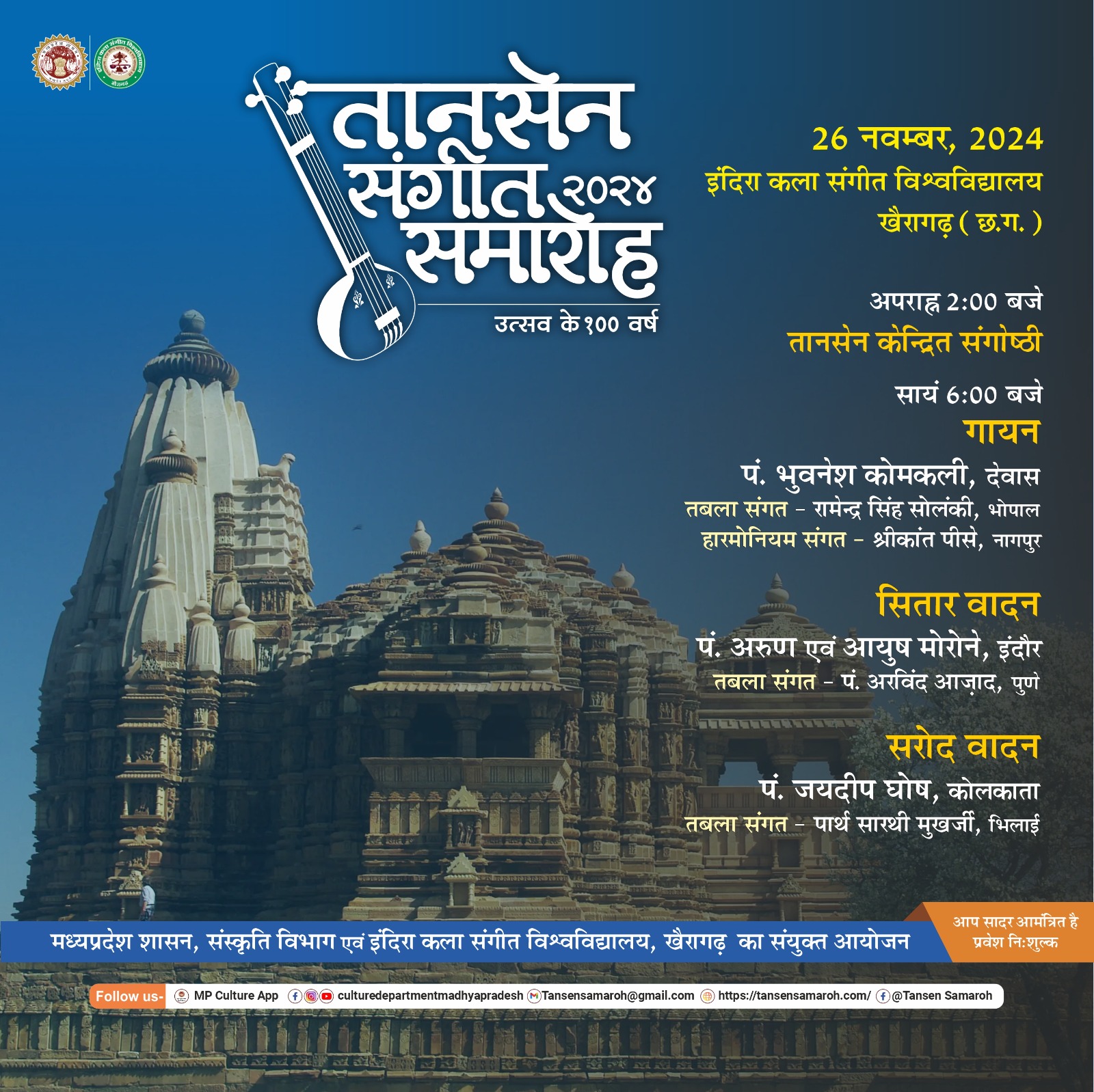 तानसेन संगीत समारोह २०२४ उत्सव के १०० वर्ष दिनांक -26 नवम्बर, 2024 स्थान -इंदिरा कला संगीत विश्वविद्यालय, खैरागढ़ ( छ.ग. ) अपराह्न संगोष्ठी- समय - दोपहर 2 बजे से। तानसेन केंद्रित संगोष्ठी कार्यक्रम, सांय-6.30 से तानसेन केन्द्रित संगोष्ठी गायन पं. भुवनेश कोमकली, देवास तबला संगत - रामेन्द्र सिंह सोलंकी, भोपाल हारमोनियम संगत - श्रीकांत पीसे, नागपुर सितार वादन पं. अरुण एवं आयुष मोरोने, इंदौर तबला संगत - पं. अरविंद आज़ाद, पुणे सरोद वादन पं. जयदीप घोष, कोलकाता तबला संगत - पार्थ सारथी मुखर्जी, भिलाई मध्यप्रदेश शासन, संस्कृति विभाग एवं इंदिरा कला संगीत विश्वविद्यालय, खैरागढ़ का संयुक्त आयोजन Follow us- आप सादर आमंत्रित है प्रवेश निःशुल्क @ MP Culture App + culturedepartmentmadhyapradesh Tansensamaroh@gmail.com @ https://tansensamaroh.com/ 4 @Tansen Samaroh