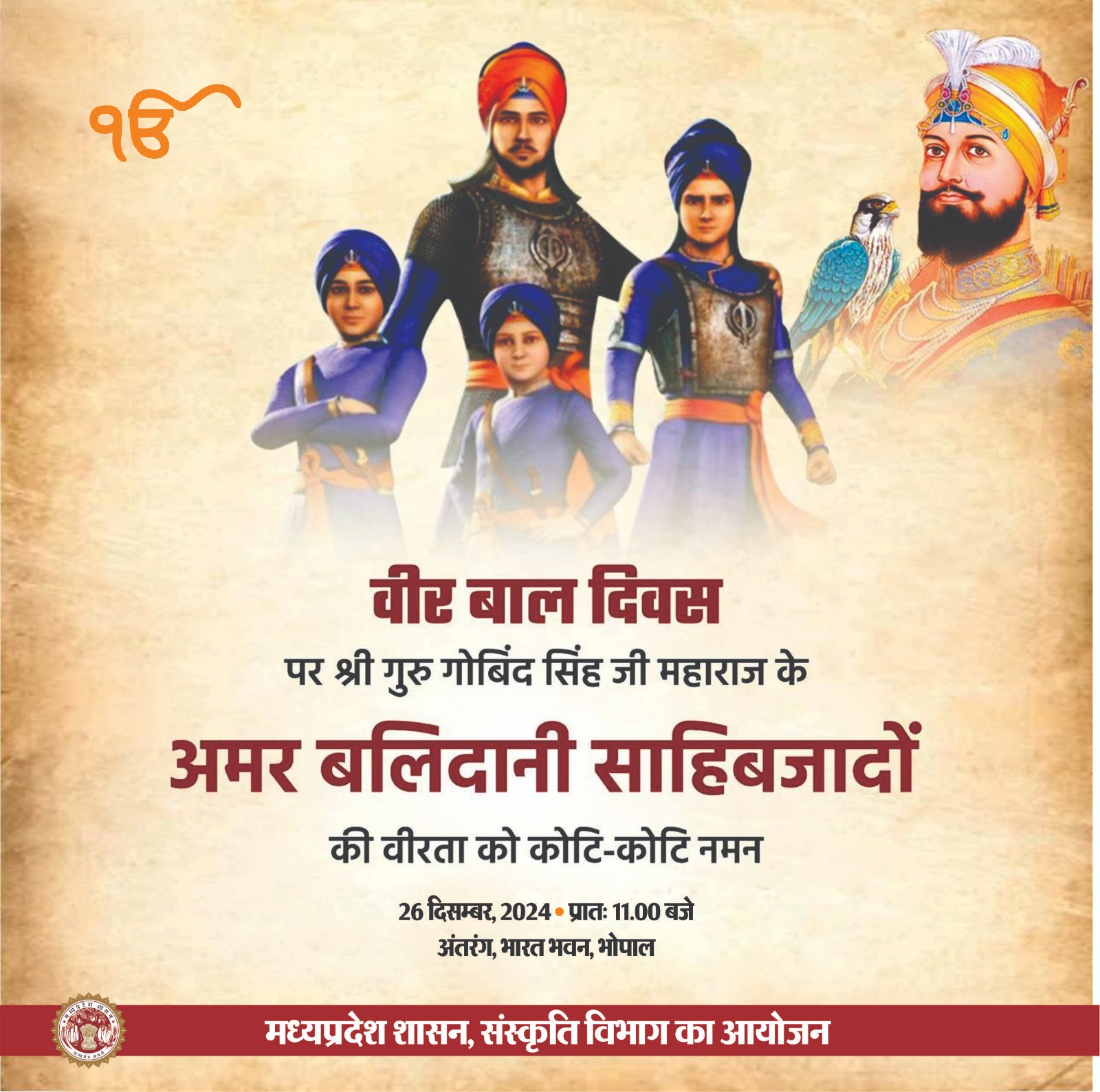 वीर बाल दिवस पर श्री गुरु गोबिंद सिंह जी महाराज के अमर बलिदानी साहिबजादों की वीरता को कोटि-कोटि नमन 26 दिसम्बर, 2024 • प्रातः 11.00 बजे स्थान-अंतरंग, भारत भवन, भोपाल प्रदेश के सभी जिलों में पंजाबी साहित्य, बोली, गीत-संगीत और शौर्य पर आधारित विभिन्न गतिविधियां आयोजित होंगी। भोपाल स्थित भारत भवन के अंतरंग सभागार में भी विशेष कार्यक्रम आयोजित होगा, जिसमें कीर्तन, लघु फिल्म प्रदर्शन और अन्य सांस्कृतिक कार्यक्रम होंगे। मध्यप्रदेश शासन, संस्कृति विभाग का आयोजन
