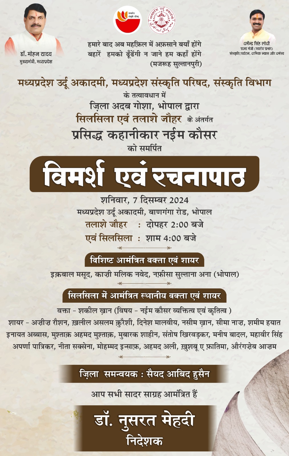 #Zila_Bhopal #Silsila #Talash_E_Jauhar #MpUrduAcademey #mpculturedeptt हमारे बाद अब महफ़िल में अफ़साने बयाँ होंगे बहारें हमको ढूँढेंगी न जाने हम कहाँ होंगे (मजरूह सुल्तानपुरी) मध्यप्रदेश उर्दू अकादमी, मध्यप्रदेश संस्कृति परिषद, संस्कृति विभाग के तत्वावधान में ज़िला अदब गोशा, भोपाल द्वारा सिलसिला एवं तलाशे जौहर के अंतर्गत प्रसिद्ध कहानीकार नईम कौसर को समर्पित विमर्श एवं रचनापाठ शनिवार, 7 दिसम्बर 2024 स्थान :मध्यप्रदेश उर्दू अकादमी, बाणगंगा रोड, भोपाल तलाशे जौहर : दोपहर 2:00 बजे एवं सिलसिला : शाम 4:00 बजे विशिष्ट आमंत्रित वक्ता एवं शायर इक़बाल मसूद, क़ाज़ी मलिक नवेद, नफ़ीसा सुल्ताना अना (भोपाल) सिलसिला में आमंत्रित स्थानीय वक्ता एवं शायर वक्ता - शकील खान (विषय - नईम कौसर व्यक्तित्व एवं कृतित्व) शायर - अज़ीज़ रौशन, खलील असलम क़ुरैशी, दिनेश मालवीय, नसीम खान, सीमा नाज़, शमीम हयात, इनायत अब्बास मुश्ताक़ अहमद मुश्ताक़, मुबारक शाहीन, संतोष खिरवड़कर, मनीष बादल, महावीर सिंह, अपर्णा पात्रिकर, नीता सक्सेना, मोहम्मद इन्साफ़, अहमद अली, खुशबू ए फ़ातिमा, औरंगज़ेब ज़िला समन्वयक : सैयद आबिद हुसैन आप सभी सादर साग्रह आमंत्रित हैं डॉ. नुसरत मेहदी निदेशक