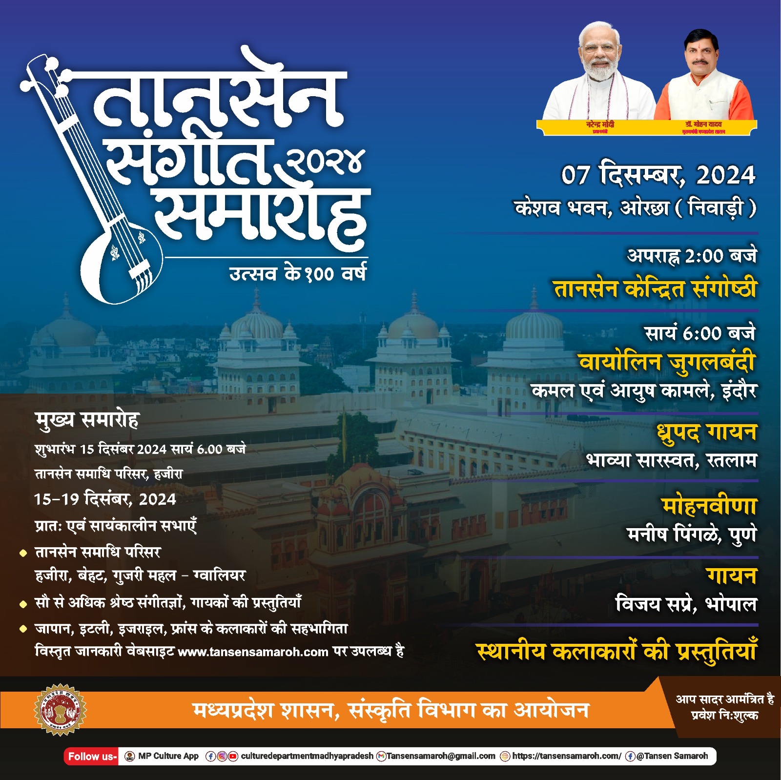 तानसेन संगीत २०२४ समारोह उत्सव के १०० वर्ष 07 दिसम्बर, 2024 स्थान - केशव भवन, ओरछा (निवाड़ी ) अपराह्न 2:00 बजे तानसेन केन्द्रित संगोष्ठी सायं 6:00 बजे वायोलिन जुगलबंदी कमल एवं आयुष कामले, इंदौर ध्रुपद गायन भाव्या सारस्वत, रतलाम मोहनवीणा- मनीष पिंगळे, पुणे गायन विजय सप्रे, भोपाल स्थानीय कलाकारों की प्रस्तुतियाँ मध्यप्रदेश शासन, संस्कृति विभाग का आयोजन आप सादर आमंत्रित है प्रवेश निःशुल्क