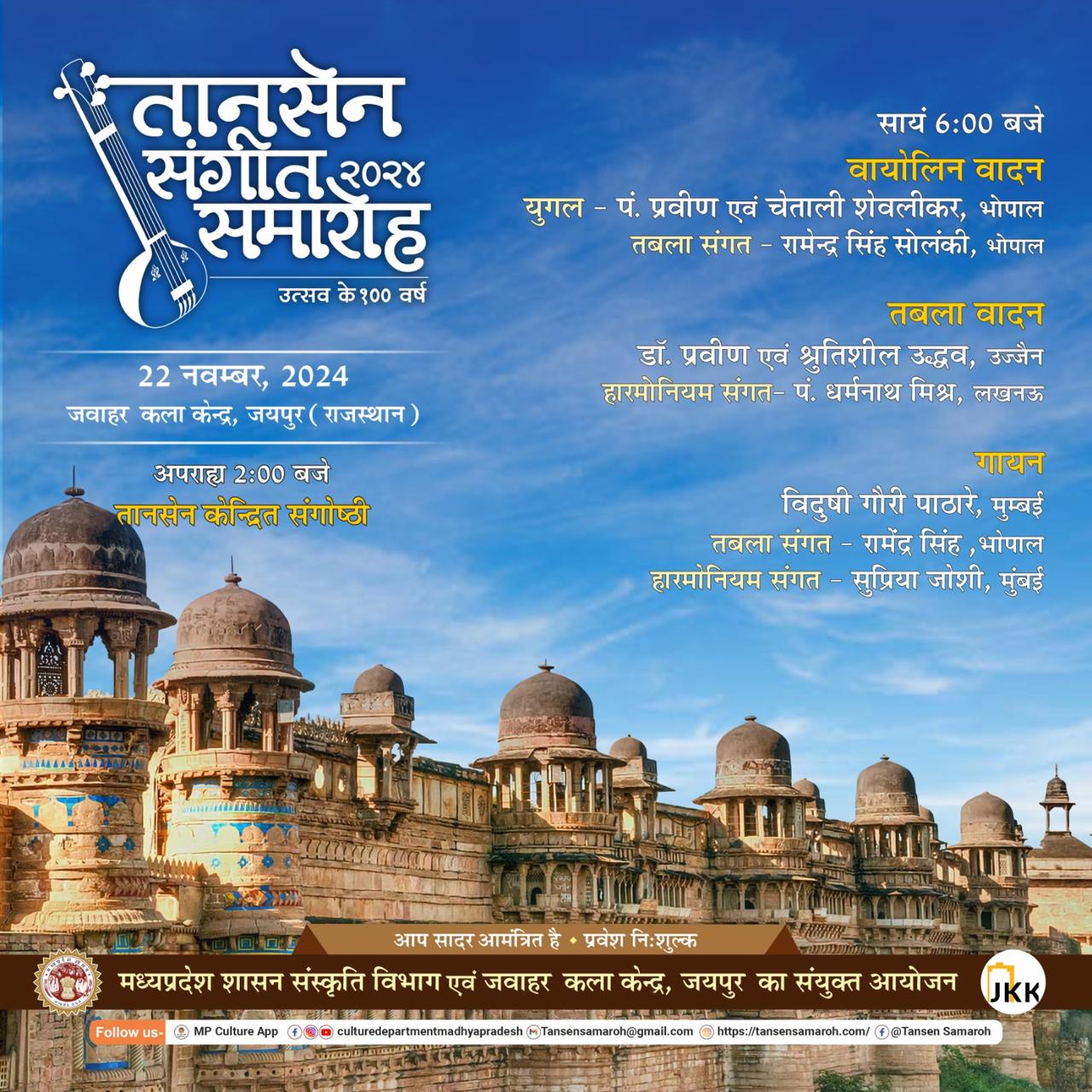 100वाँ तानसेन शताब्दी समारोह विश्व संगीत समागम राष्ट्रीय आगाज श्रंखला दिनांक - 22 नवम्बर, 2024 समय- सायं 6:00 बजे स्थान - जवाहर कला केन्द्र, जयपुर (राजस्थान ) वायलिन युगल - पं प्रवीण एवं चेताली शेवलिकर, भोपाल तबला संगत - रामेन्द्र सिंह सोलंकी, भोपाल तबला डॉ. प्रवीण एवं श्रुतिशील उद्धव, उज्जैन हारमोनियम संगत - पं. धर्मनाथ मिश्र, लखनऊ गायन विदुषी गौरी पाठारे, मुम्बई तबला संगत - रामेंद्र सिंह सोलंकी, भोपाल हारमोनियम संगत - सुप्रिया जोशी, मुंबई आप सादर आमंत्रित है • प्रवेश निःशुल्क मध्यप्रदेश शासन संस्कृति विभाग एवं जवाहर कला केन्द्र, जयपुर का संयुक्त आयोजन Follow us- @ MP Culture App 100 culturedepartmentmadhyapradesh Tansensamaroh@gmail.com @ https://tansensamaroh.com/ f @Tansen Samaroh