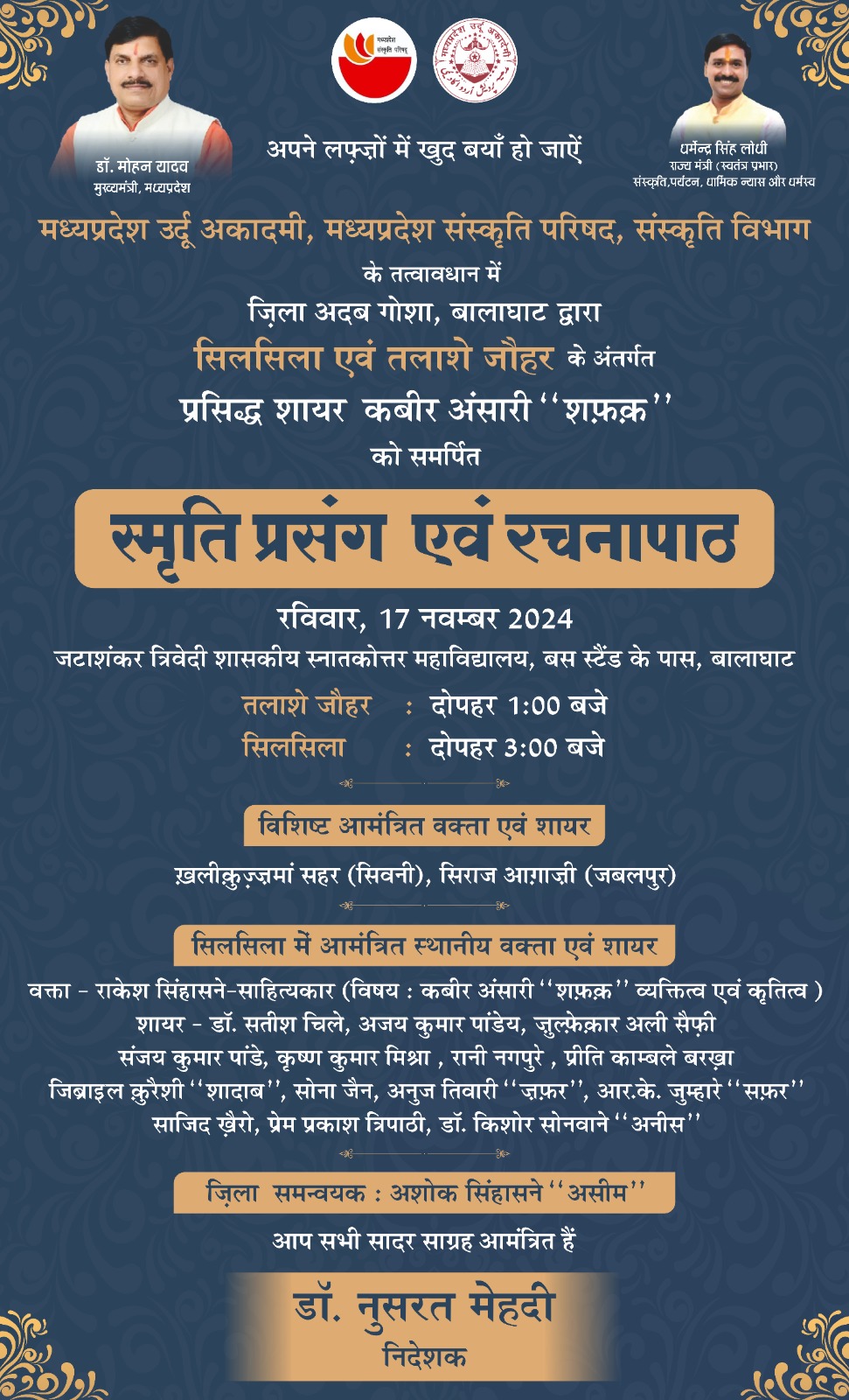 अपने लफ़्ज़ों में खुद बयाँ हो जाऐं मध्यप्रदेश उर्दू अकादमी, मध्यप्रदेश संस्कृति परिषद, संस्कृति विभाग के तत्वावधान में ज़िला अदब गोशा, बालाघाट द्वारा सिलसिला एवं तलाशे जौहर के अंतर्गत प्रसिद्ध शायर कबीर अंसारी "शफ़क़" को समर्पित स्मृति प्रसंग एवं रचनापाठ रविवार, 17 नवम्बर 2024 जटाशंकर त्रिवेदी शासकीय स्नातकोत्तर महाविद्यालय, बस स्टैंड के पास, बालाघाट तलाशे जौहर : दोपहर 1:00 बजे सिलसिला : दोपहर 3:00 बजे विशिष्ट आमंत्रित वक्ता एवं शायर ख़लीकुज़्ज़मां सहर (सिवनी), सिराज आग़ाज़ी (जबलपुर) सिलसिला में आमंत्रित स्थानीय वक्ता एवं शायर वक्ता - राकेश सिंहासने-साहित्यकार (विषय: कबीर अंसारी "शफ़क़" व्यक्तित्व एवं कृतित्व) शायर - डॉ. सतीश चिले, अजय कुमार पांडेय, जुल्फ़ेक्रार अली सैफ़ी संजय कुमार पांडे, कृष्ण कुमार मिश्रा, रानी नगपुरे, प्रीति काम्बले बरखा, जिब्राइल कुरैशी "शादाब", सोना जैन, अनुज तिवारी "जफ़र", आर. के. जुम्हारे "सफ़र", साजिद खैरो, प्रेम प्रकाश त्रिपाठी, डॉ. किशोर सोनवाने "अनीस" ज़िला समन्वयक : अशोक सिंहासने "असीम" आप सभी सादर साग्रह आमंत्रित हैं डॉ. नुसरत मेहदी निदेशक