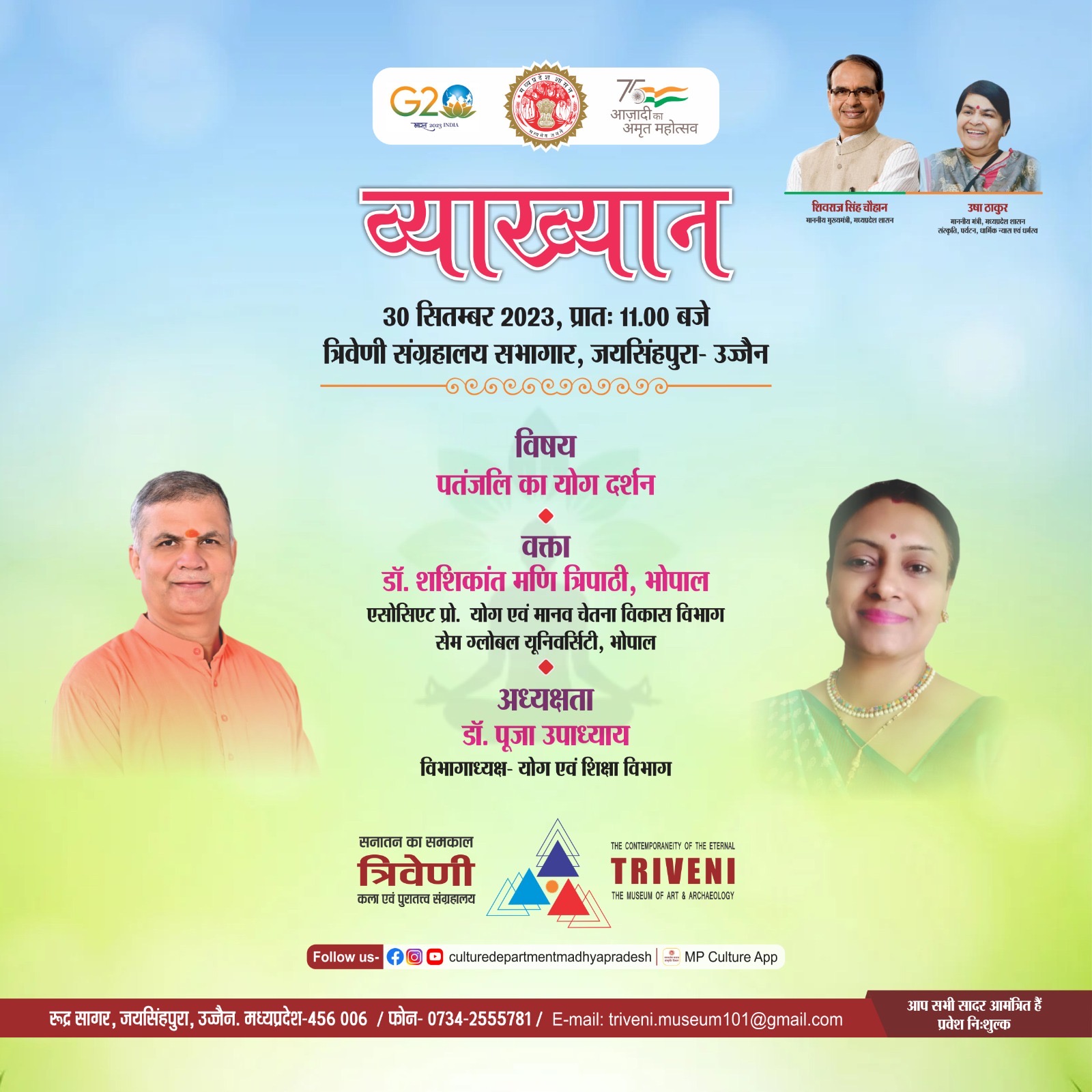 त्रिवेणी कला संग्रहालय , उज्जैन द्वारा दिनांक 30 सितम्बर 2023 , शनिवार को ‘पतंजलि का योग दर्शन’ विषय पर केंद्रित व्याख्यान आयोजित होगा जिसके मुख्य वक्ता के डॉ. शशिकांत त्रिपाठी, भोपाल होंगे ! कार्यक्रम की अध्यक्षता डॉ. पूजा उपाध्याय, उज्जैन करेंगी !