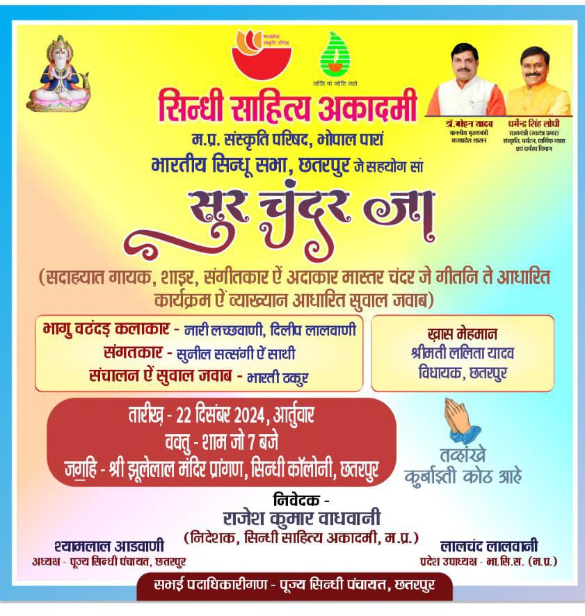 भारतीय सिन्धू सभा एवं पूज्य सिन्धी पंचायत छतपुर के स्थानीय सहयोग से सदाहयात गायक, शाइर संगीतकार ऐं अदाकार मास्तर चंदर के गीतों पर आधारित सांस्कृतिक प्रस्तुति, नारायण श्याम केन्द्रित व्याख्या तथा व्याख्यान आधारित सवाल-जवाब