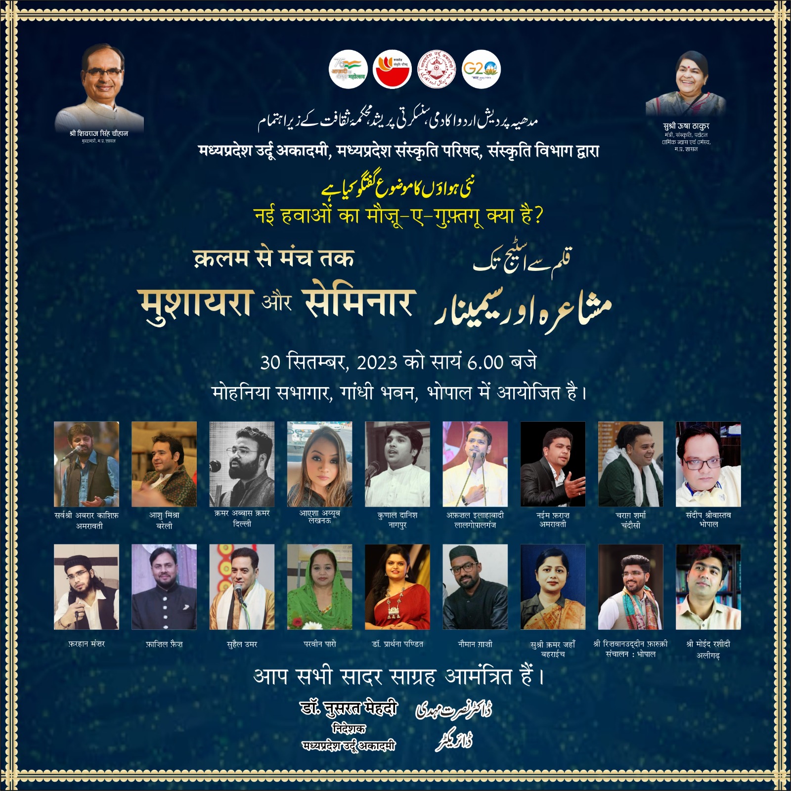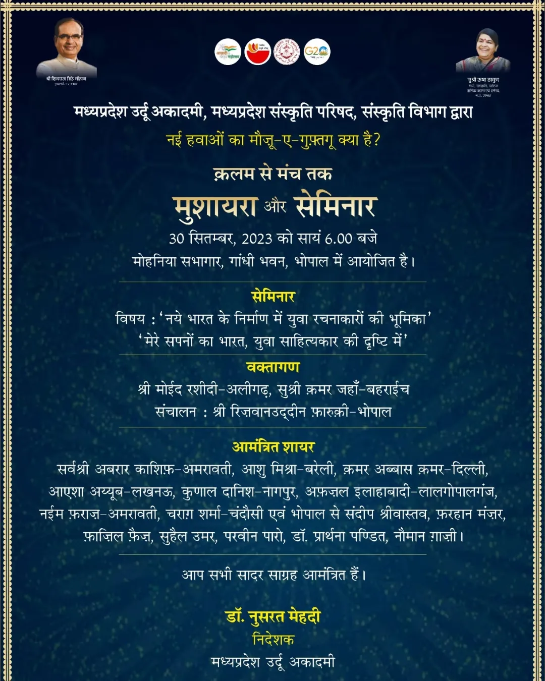 मध्यप्रदेश उर्दू अकादमी, मध्यप्रदेश संस्कृति परिषद, संस्कृति विभाग द्वारा नई हवाओं का मौज़ू-ए-गुफ़्तगू क्या है (ज़फ़र सहबाई) क़लम से मंच तक मुशायरा और सेमिनार 30 सितम्बर, 2023 को सायं 6.00 बजे मोहनिया सभागार, गांधी भवन, भोपाल में आयोजित है । सेमिनार विषय : ‘नये भारत के निर्माण में युवा रचनाकारों की भूमिका' 'मेरे सपनों का भारत, युवा साहित्यकार की दृष्टि में' वक्तागण श्री मोईद रशीदी-अलीगढ़, सुश्री क़मर जहाँ- बहराईच संचालन : श्री रिज़वानउद्दीन फ़ारुक़ी-भोपाल आमंत्रित शायर सर्वश्री अबरार काशिफ़-अमरावती, आशु मिश्रा- बरेली, क़मर अब्बास क़मर - दिल्ली, आएशा अय्यूब - लखनऊ, कुणाल दानिश नागपुर, अफ़ज़ल इलाहाबादी-लालगोपालगंज, नईम फ़राज़- अमरावती, चराग़ शर्मा - चंदौसी एवं भोपाल से संदीप श्रीवास्तव, फ़रहान मंज़र, फ़ाज़िल फ़ैज़, सुहैल उमर, परवीन पारो, डॉ. प्रार्थना पण्डित, नौमान ग़ाज़ी । आप सभी सादर साग्रह आमंत्रित हैं। डॉ. नुसरत मेहदी निदेशक, मध्यप्रदेश उर्दू अकादमी