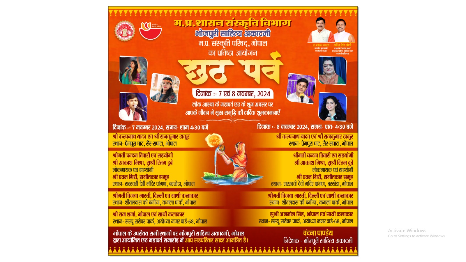 भोजपुरी समाज का प्रसिद्ध पर्व 'छठ पर्व' सूर्य आराधना पर केन्द्रित के अवसर पर अकादमी द्वारा प्रेमपुरा घाट, सैर-सपाटा, भोपाल में आयोजन किया जा रहा है। कार्यक्रम में देश-प्रदेश के प्रख्यात कलाकारों द्वारा प्रस्तुति दी जावेगी। भोपाल के अन्य स्थलों- सरस्वती देवी मंदिर प्रांगण-बरखेडा, शीतलदास की बगिया-कमला पार्क, सरयू सरोवर पार्क-अयोध्या नगर में संस्कृति विभाग, भोजपुरी साहित्य अकादमी, भोपाल के सहयोग से आयोजित किया जा रहा है।