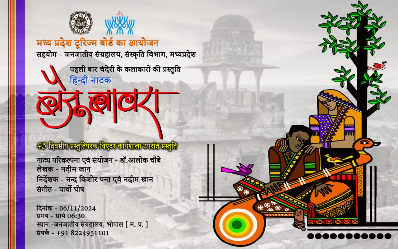 मध्य प्रदेश टूरिज्म बोर्ड का आयोजन सहयोग - जनजातीय संग्रहालय, संस्कृति विभाग, मध्यप्रदेश पहली बार चंदेरी के कलाकारों की प्रस्तुति हिन्दी नाटक बैजू बावरा 45 दिवसीय प्रस्तुतिपरक थिएटर कार्यशाला उपरांत प्रस्तुति नाट्य परिकल्पना एवं संयोजन - डॉ. आलोक चौबे लेखक - नदीम खान निर्देशक - नन्द किशोर पन्त एवं नदीम खान संगीत - पार्थो घोष दिनांक - 06/11/2024 समय - सायं 06:30 स्थान -जनजातीय संग्रहालय, भोपाल [ म. प्र.] संपर्क - +918224951101