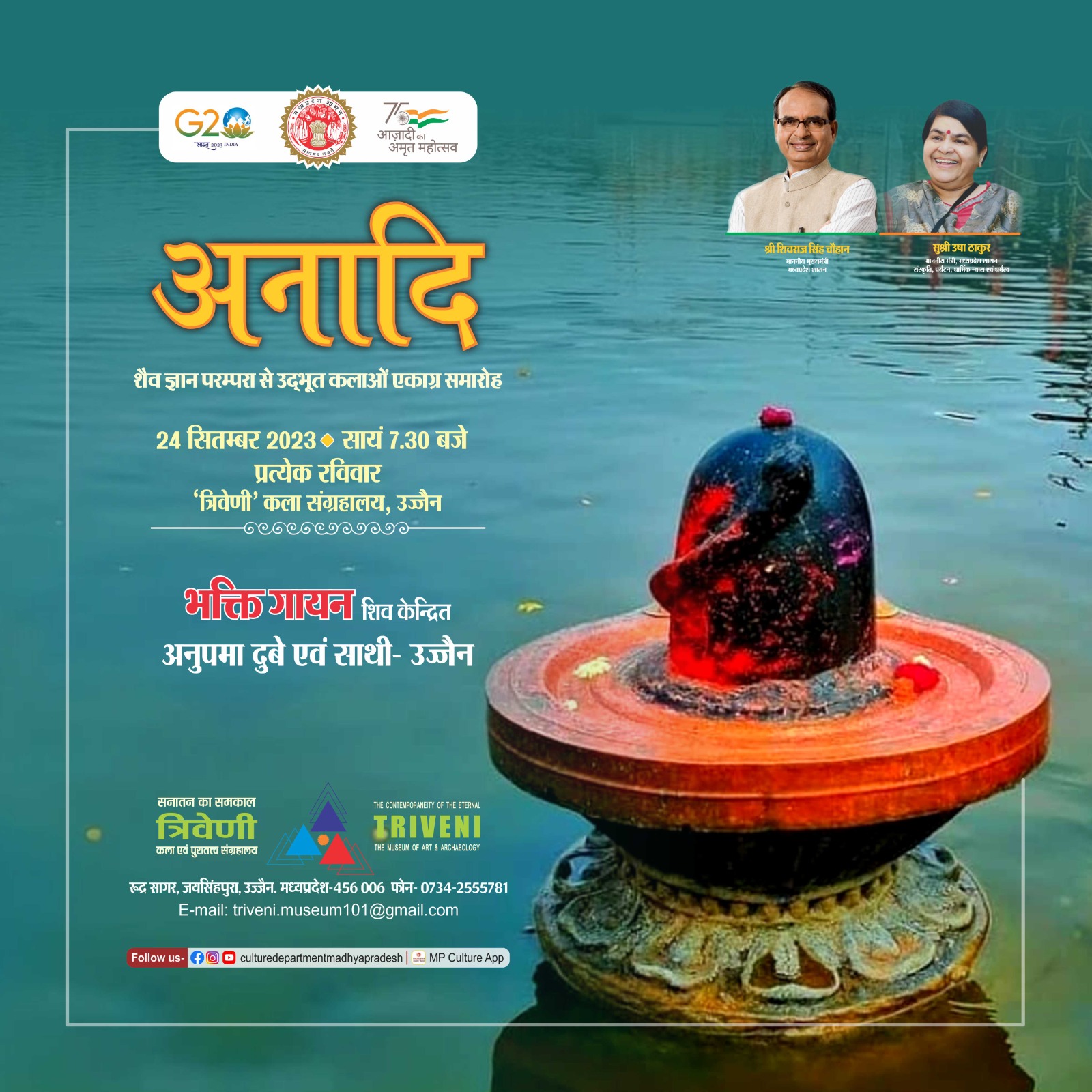 त्रिवेणी कला संग्रहालय द्वारा आयोजित शैव ज्ञान परंपरा से उद्भूत कलाओं पर एकाग्र साप्ताहिक श्रंखला अनादि के अन्तर्गत दिनांक - 24.09.2023 रविवार को शिव केन्द्रित भक्ति गायन की प्रस्तुति सुश्री अनुपना दुबे एवं साथियों द्वारा त्रिवेणी संग्रहालय परिसर में आयोजित होगी ।