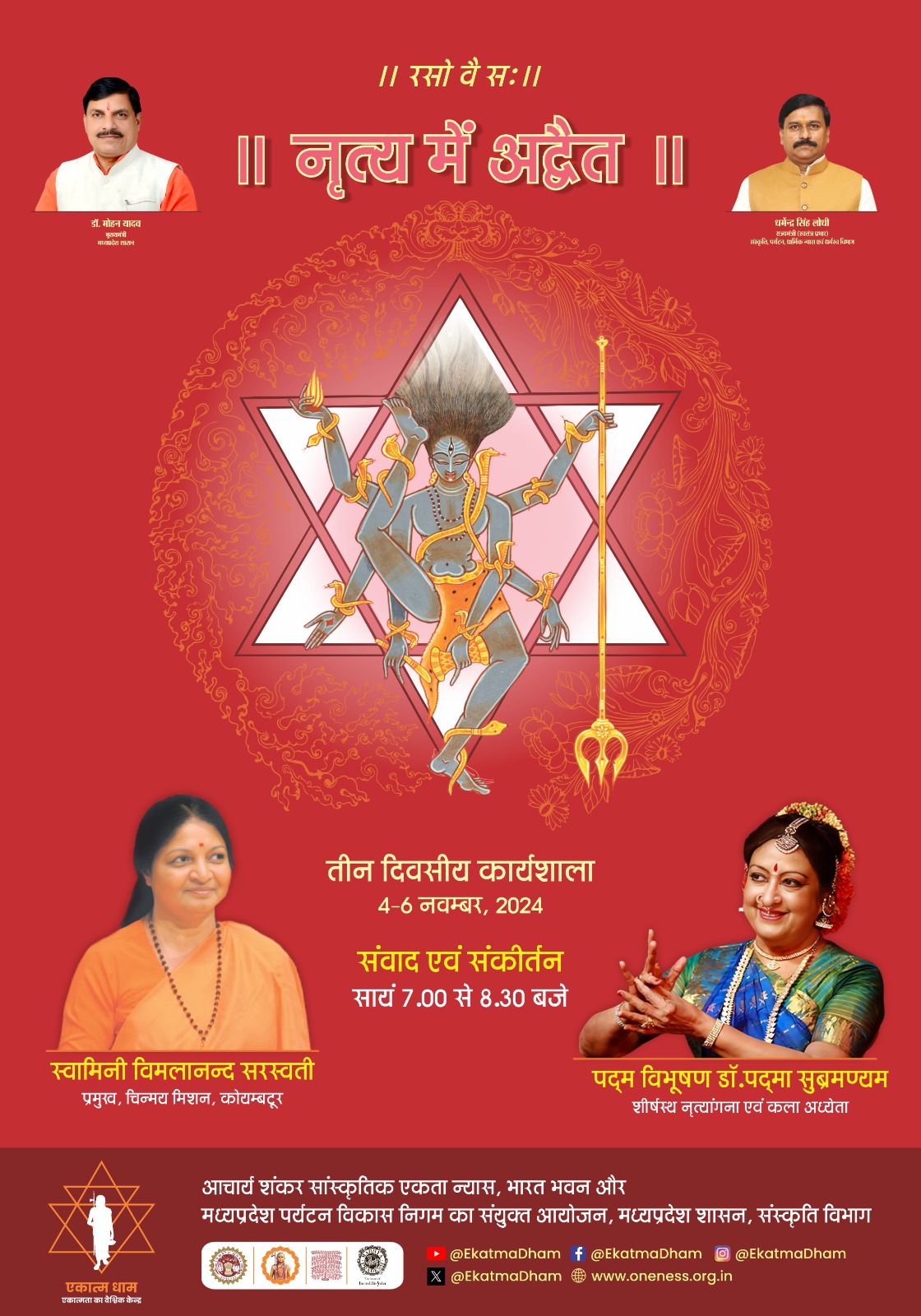 आचार्य शंकर सांस्कृतिक एकता न्यास, संस्कृति विभाग, मध्य प्रदेश शासन द्वारा भारत भवन, भोपाल में दिनांक 04 नवम्बर, 2024 से 06 नवम्बर, 2024 तक भारत भवन में पहली बार इस तरह के अनूठे एवं नवीन सन्दर्भ में 'नृत्य में अद्वैत' विषयों पर तीन दिवसीय कार्यशाला होगी, जिसमें नृत्य से जुड़े विविध सत्र आयोजित होंगे, जिसमें विश्व प्रसिद्ध भरतनाट्यम नृत्यांगना पद्म विभूषण डॉ. पद्मा सुब्रमण्यम, नृत्यांगना डॉ.पद्मजा सुरेश, केंद्रीय संगीत नाटक अकादमी की अध्यक्ष डॉ. संध्या पुरेचा, कला मर्मज्ञ डॉ. राधावल्लभ त्रिपाठी सहित 60 नृत्य अध्येता एवं कलाकार सम्मिलित होंगे। यह कार्यशाला प्रतिदिन प्रातः 09:00 बजे से रात्रि 07:00 बजे तक चलेगी, जिसमें प्रतिदिन सायं 07:00 से 08:30 बजे तक कला रसिकों के लिए विशेष सत्र आयोजित होगा। इस सत्र में शहर के कलाप्रेमी, शोधार्थी एवं जिज्ञासु शामिल हो सकते है।