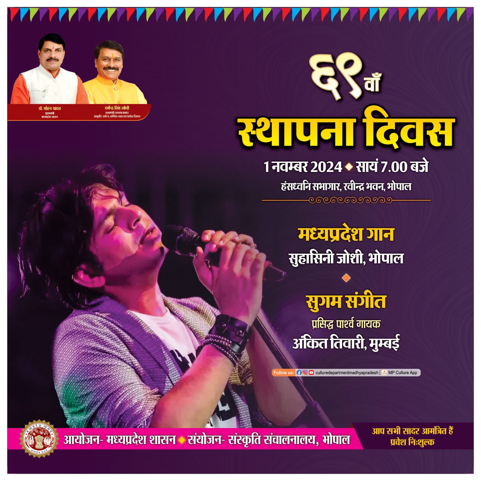 69वाँ मध्यप्रदेश स्थापना दिवस समारोह 1 नवम्बर, 2024 हंसध्वनी सभागार, रवींद्र भवन, भोपाल, सायं 7 बजे मध्यप्रदेश गान सुश्री सुहासिनी जोशी, भोपाल सुगम संगीत श्री अंकित तिवारी, मुम्बई आप सभी सादर आमंत्रित हैं प्रवेश निःशुल्क आयोजन : मध्यप्रदेश शासन संयोजन : संस्कृति संचालनालय, भोपाल