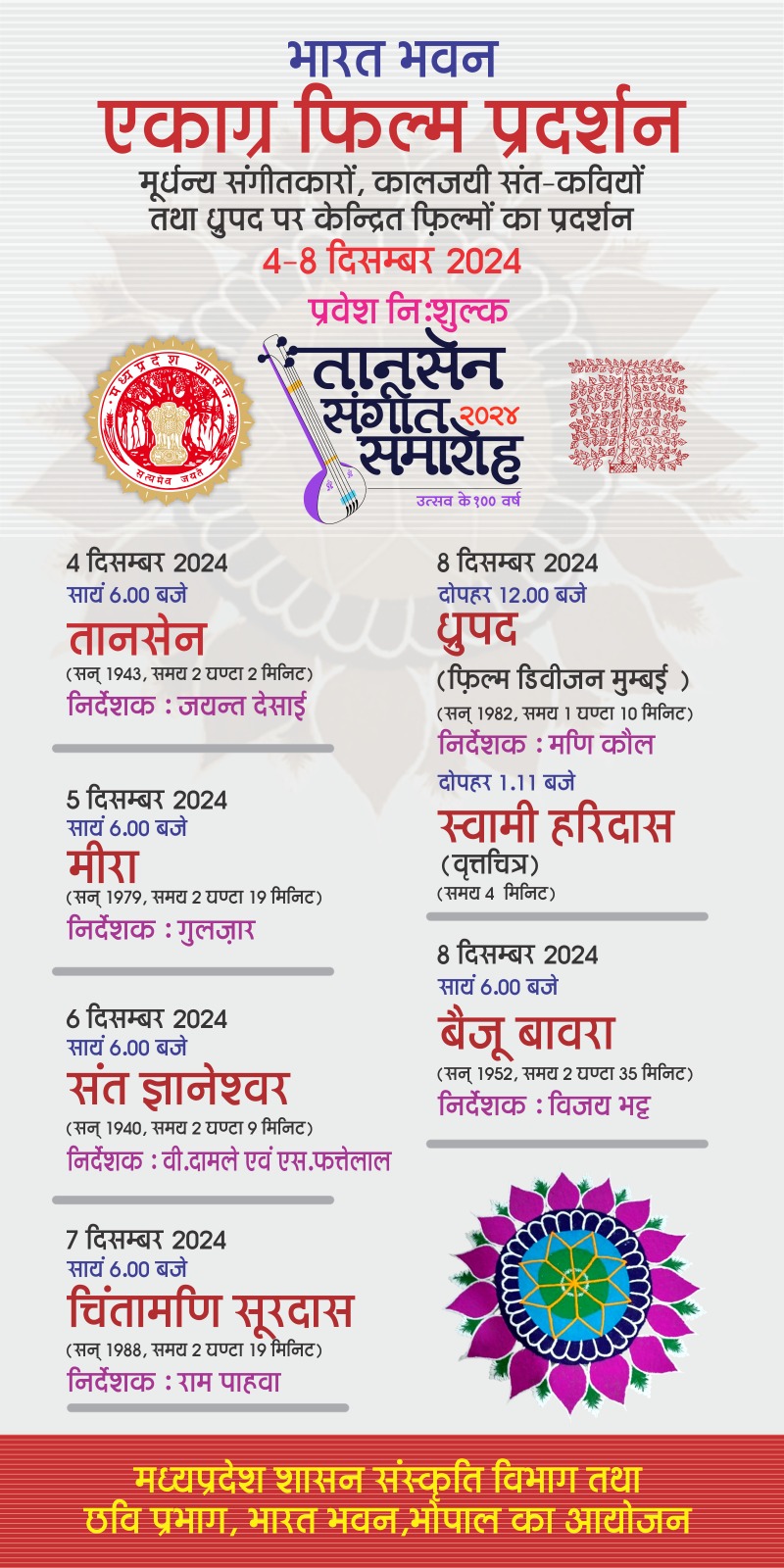 भारत भवन एकाग्र फिल्म प्रदर्शन मूर्धन्य संगीतकारों, कालजयी संत-कवियों तथा ध्रुपद पर केन्द्रित फ़िल्मों का प्रदर्शन प्रवेश निःशुल्क 4-8 दिसम्बर 2024 4 दिसम्बर 2024 सायं 6.00 बजे तानसेन प्रवेश निःशुल्क तानसेन संगीत २०२४ समारोह (सन् 1943, समय 2 घण्टा 2 मिनिट ) निर्देशक : जयन्त देसाई 5 दिसम्बर 2024 सायं 6.00 बजे मीरा (सन् 1979, समय 2 घण्टा 19 मिनिट) निर्देशक : गुलज़ार 6 दिसम्बर 2024 सायं 6.00 बजे संत ज्ञानेश्वर (सन् 1940, समय 2 घण्टा 9 मिनिट) निर्देशक : वी. दामले एवं एस. फत्तेलाल 7 दिसम्बर 2024 सायं 6.00 बजे चिंतामणि सूरदास (सन् 1988, समय 2 घण्टा 19 मिनिट) निर्देशक : राम पाहवा 8 दिसम्बर 2024 दोपहर 12.00 बजे ध्रुपद (फ़िल्म डिवीजन मुम्बई ) (सन् 1982, समय 1 घण्टा 10 मिनिट) निर्देशक : मणि कौल दोपहर 1.11 बजे स्वामी हरिदास (वृत्तचित्र) (समय 4 मिनिट) 8 दिसम्बर 2024 सायं 6.00 बजे बैजू बावरा (सन् 1952, समय 2 घण्टा 35 मिनिट ) निर्देशक : विजय भट्ट मध्यप्रदेश शासन संस्कृति विभाग तथा छवि प्रभाग, भारत भवन, भोपाल का आयोजन