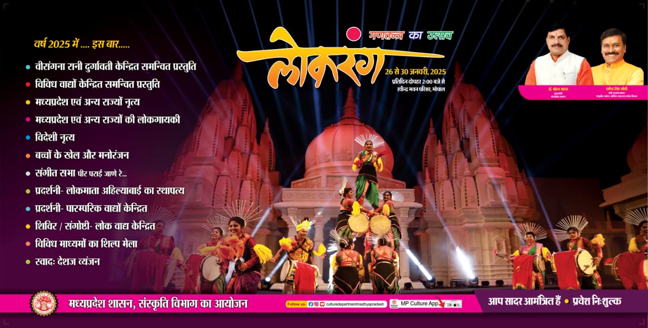गणखन्त्र का उत्सव लोकरंग 26 से 30 जनवरी, 2025 प्रतिदिन दोपहर 2:00 बजे से रवीन्द्र भवन परिसर, मोपाल मध्यप्रदेश शासन, संस्कृति विभाग का आयोजन