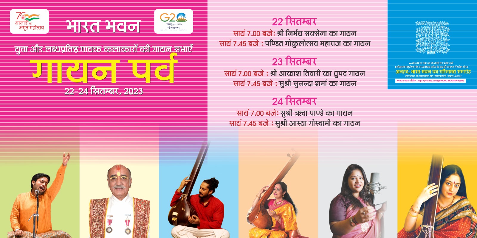 22 सितम्बर सायं 7.00 बजे: श्री निर्भय सक्सेना का गायन सायं 7.45 बजे : पण्डित गोकुलोत्सव महाराज का गायन 23 सितम्बर सायं 7.00 बजे : श्री आकाश तिवारी का ध्रुपद गायन सायं 7.45 बजे : सुश्री सुनन्दा शर्मा का गायन 24 सितम्बर सायं 7.00 बजे: सुश्री ऋचा पाण्डे का गायन सायं 7.45 बजे: सुश्री आस्था गोस्वामी का गायन