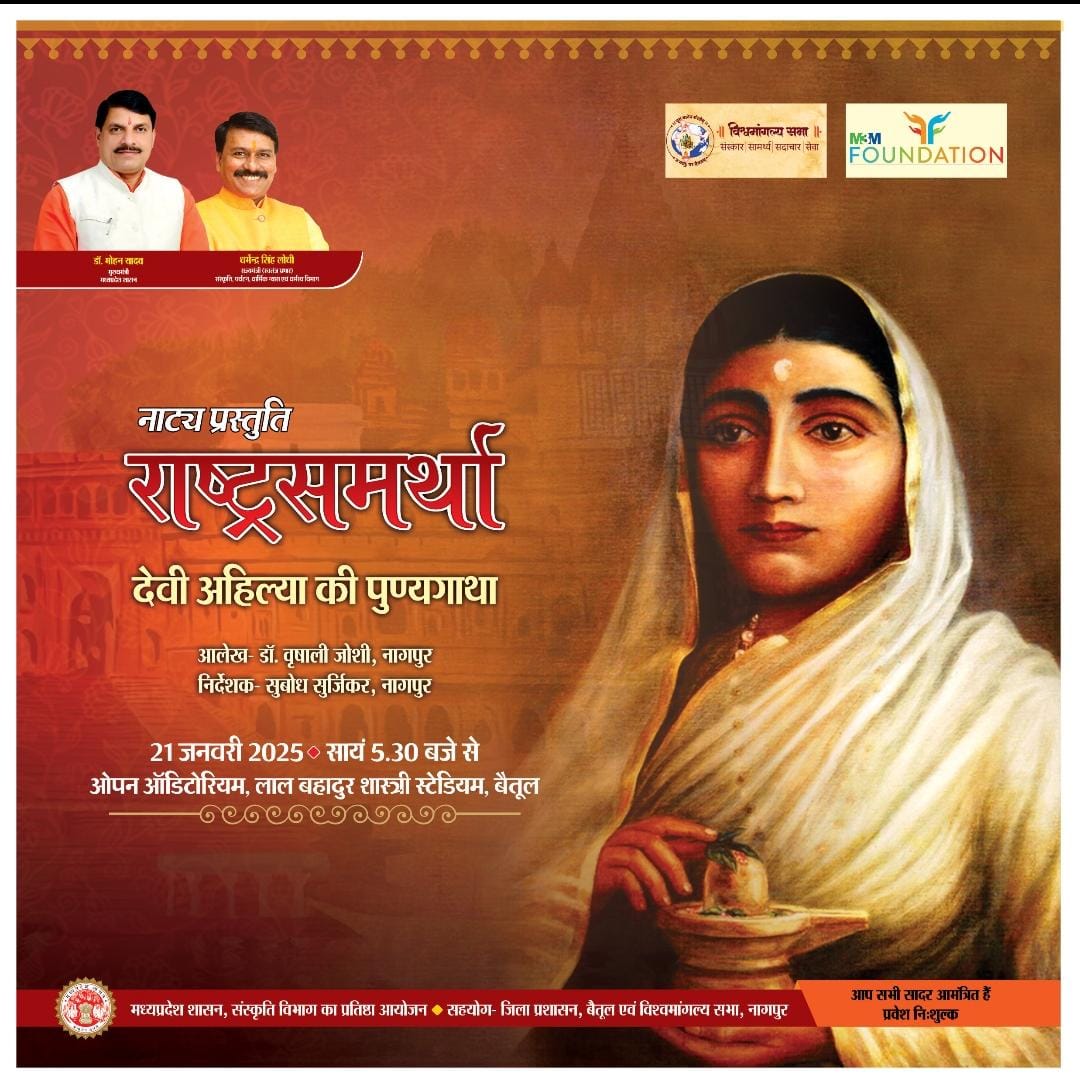 नाट्य प्रस्तुति राष्ट्रसमर्था देवी अहिल्या की पुण्यगाथा आलेख - डॉ. वृषाली जोशी, नागपुर निर्देशक- सुबोध सुर्जिकर, नागपुर 20 जनवरी 2025 सायं 5.30 बजे से ओपन ऑडिटोरियम, लाल बहादुर शास्त्री स्टेडियम, बैतूल मध्यप्रदेश शासन, संस्कृति विभाग का प्रतिष्ठा आयोजन सहयोग- जिला प्रशासन, बैतूल एवं विश्वमांगल्य सभा, नागपुर