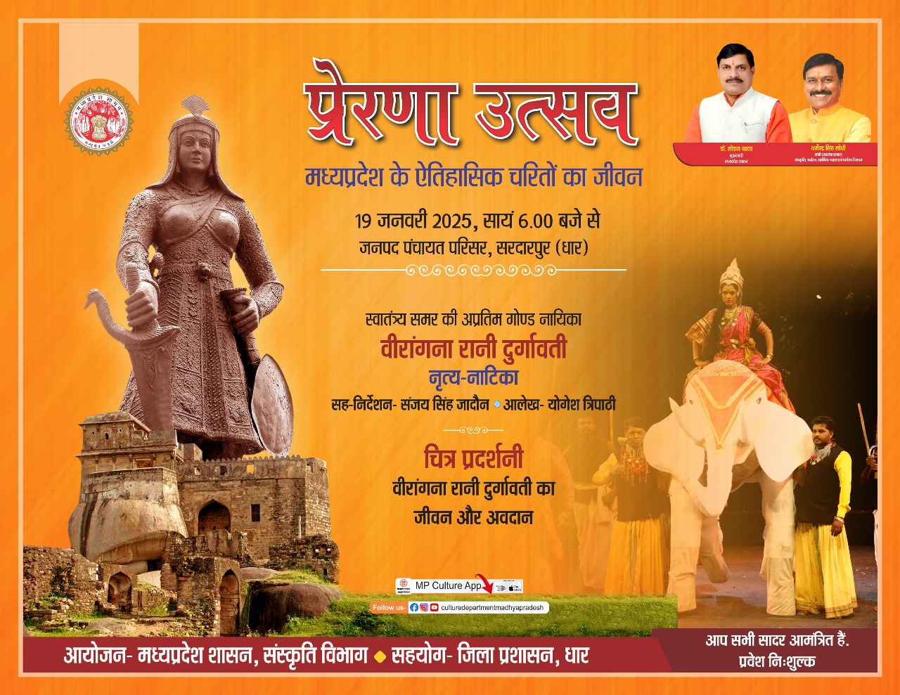 प्रेरणा उत्सव मध्यप्रदेश के ऐतिहासिक चरितों का जीवन 19 जनवरी 2025, सायं 6.00 बजे से जनपद पंचायत परिसर, सरदारपुर आयोजन- मध्यप्रदेश शासन, संस्कृति विभाग सहयोग- जिला प्रशासन, (Dhar)