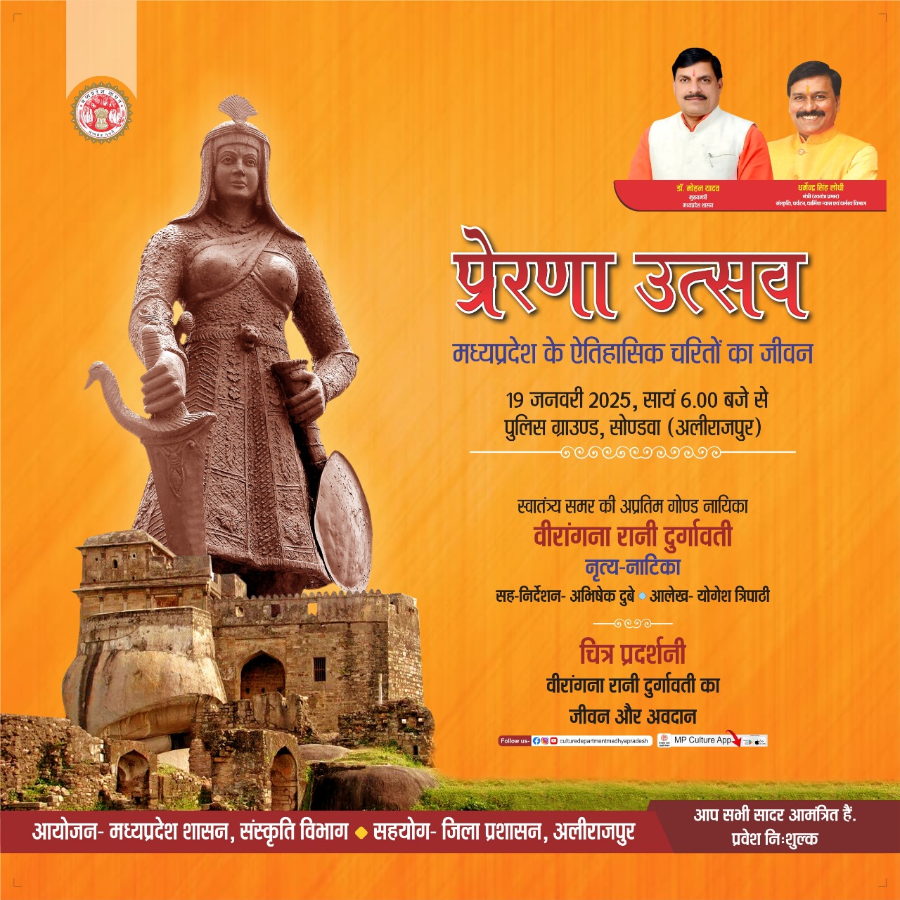 प्रेरणा उत्सव मध्यप्रदेश के ऐतिहासिक चरितों का जीवन 19 जनवरी 2025, सायं 6.00 बजे से पुलिस ग्राउण्ड, सोण्डवा, अलीराजपुर आयोजन- मध्यप्रदेश शासन, संस्कृति विभाग सहयोग- जिला प्रशासन, अलीराजपुर