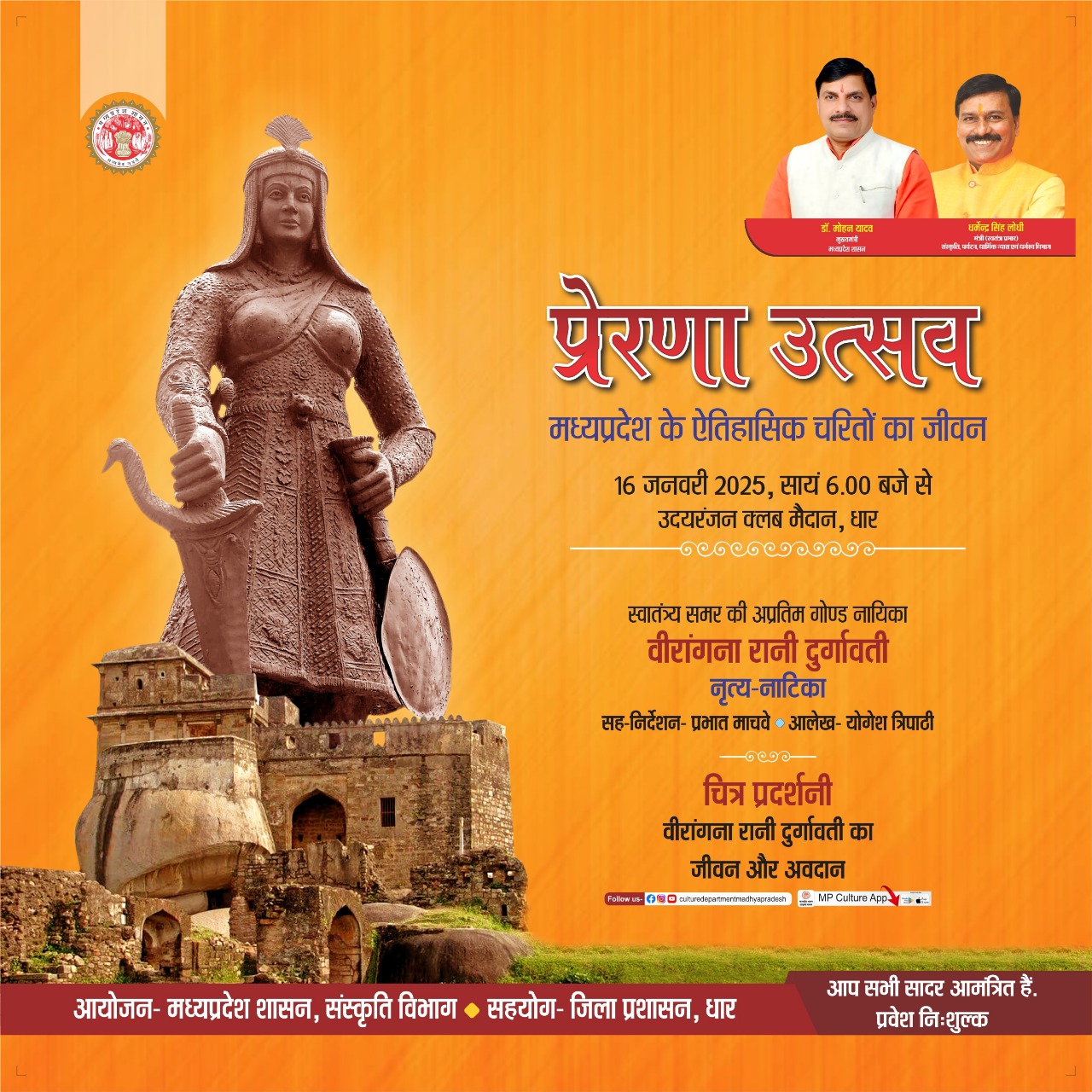 प्रेरणा उत्सव मध्यप्रदेश के ऐतिहासिक चरितों का जीवन 16 जनवरी 2025, सायं 6.00 बजे से उदयरंजन क्लब मैदान, धार आयोजन- मध्यप्रदेश शासन, संस्कृति विभाग सहयोग- जिला प्रशासन, धार