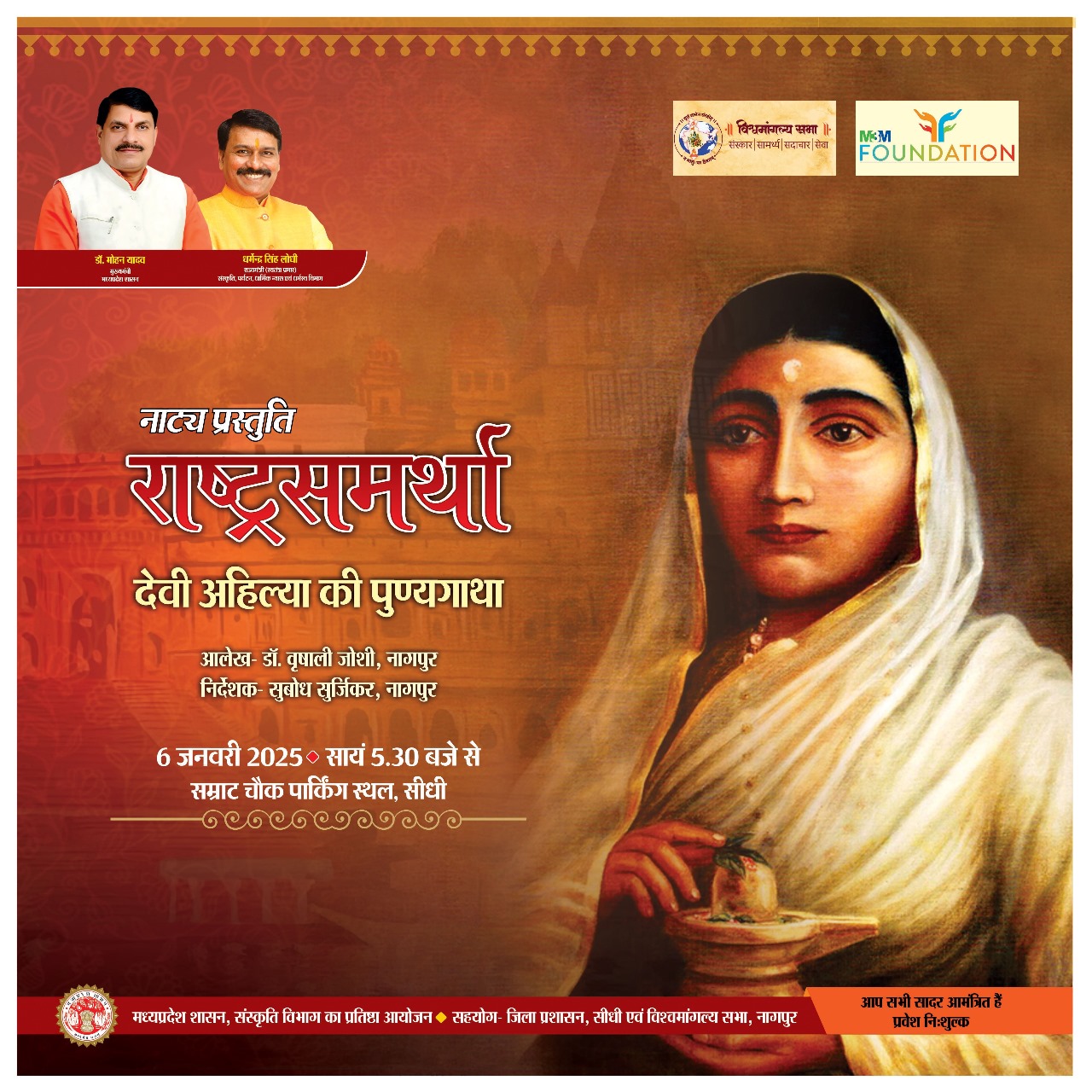 नाट्य प्रस्तुति राष्ट्रसमर्थां देवी अहिल्या की पुण्यगाथा आलेख - डॉ. वृषाली जोशी, नागपुर निर्देशक -सुबोध सुर्जिकर, नागपुर 6 जनवरी 2025, सायं 5.30 बजे से स्थान- सम्राट चौक पार्किंग स्थल, सीधी आप सभी सादर आमंत्रित हैं मध्यप्रदेश शासन, संस्कृति विभाग का प्रतिष्ठा आयोजन सहयोग - जिला प्रशासन, सीधी एवं विश्वमांगल्य सभा, नागपुर प्रवेश निःशुल्क