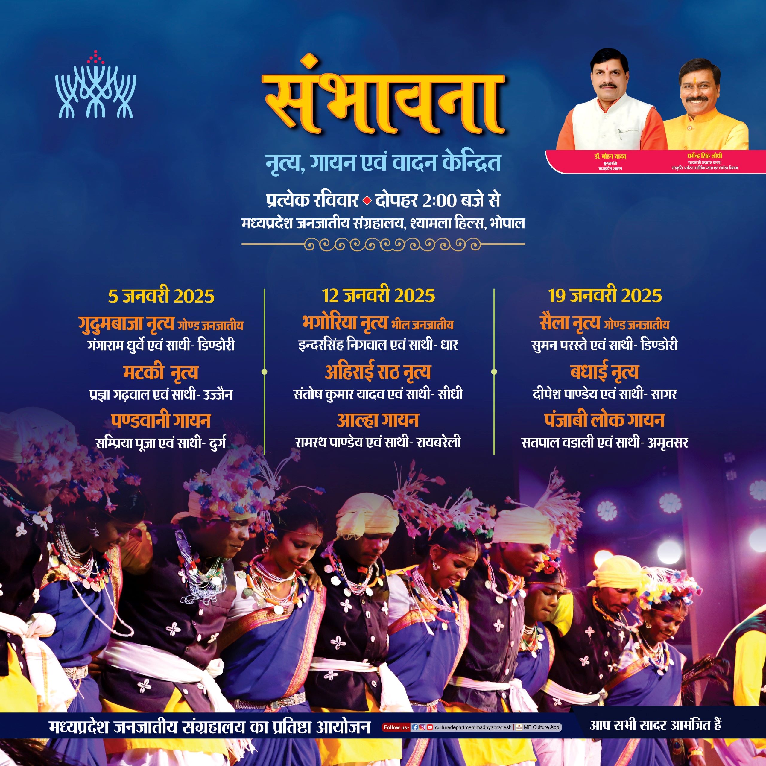 संभावना नृत्य, गायन एवं वादन केन्द्रित 5 जनवरी 2025 सायं 2:00 - 8:00 बजे मध्यप्रदेश जनजातीय संग्रहालय, श्यामला हिल्स, भोपाल