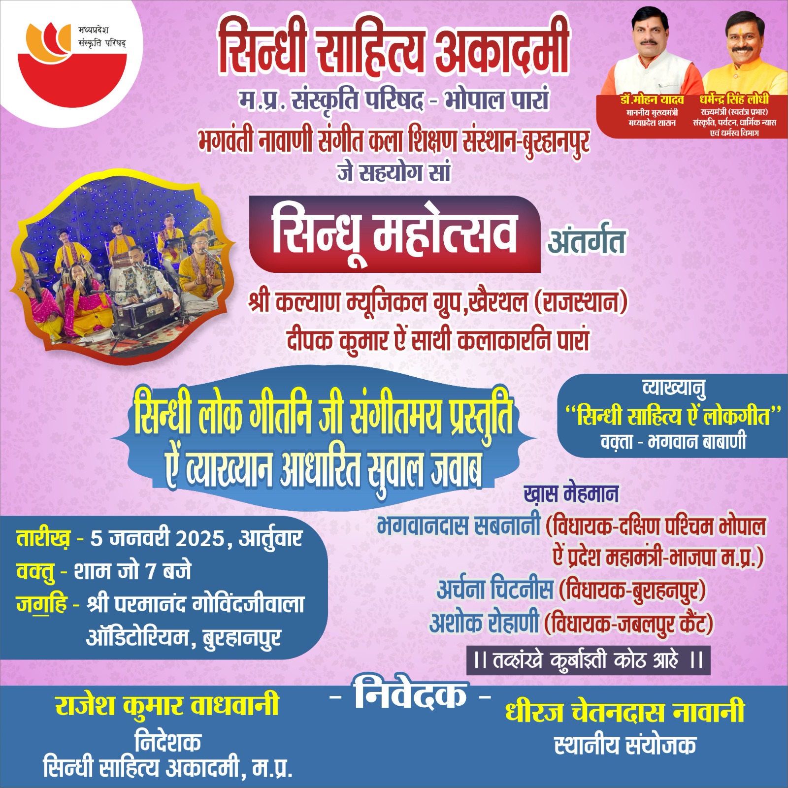 भगवंती नावाणी संगीत कला शिक्षण संस्थान के सहयोग से सिन्धी लोक गीतो की संगीत मय प्रस्तुति ऐं व्याख्यान आधारित सुवाल जवाब