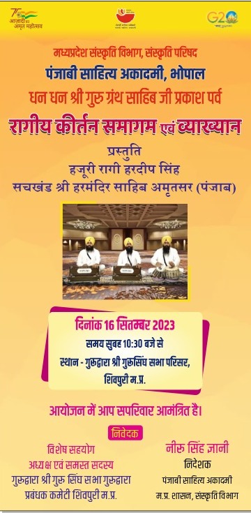 16 सितम्बर 2023 को शिवपुरी में श्री गुरू ग्रंथ साहिब प्रकाश पर्व के अवसर पर गुरू ग्रंथ साहिब के मुख्य संदेश पर केन्द्रित श्री व्याख्यान एवं रागीय गायन की प्रस्तुति अमृतसर पंजाब के भाई हरदीप सिंह हजूरी रागी जत्था सचखंड श्री हरमंदिर साहिब द्वारा की जाएगी। दिनांक 16 सितम्बर 2023 को सुबह 10ः30 से 12ः00 बजे तक गुरूद्वारा परिसर में संपन्न किया जाएगा।