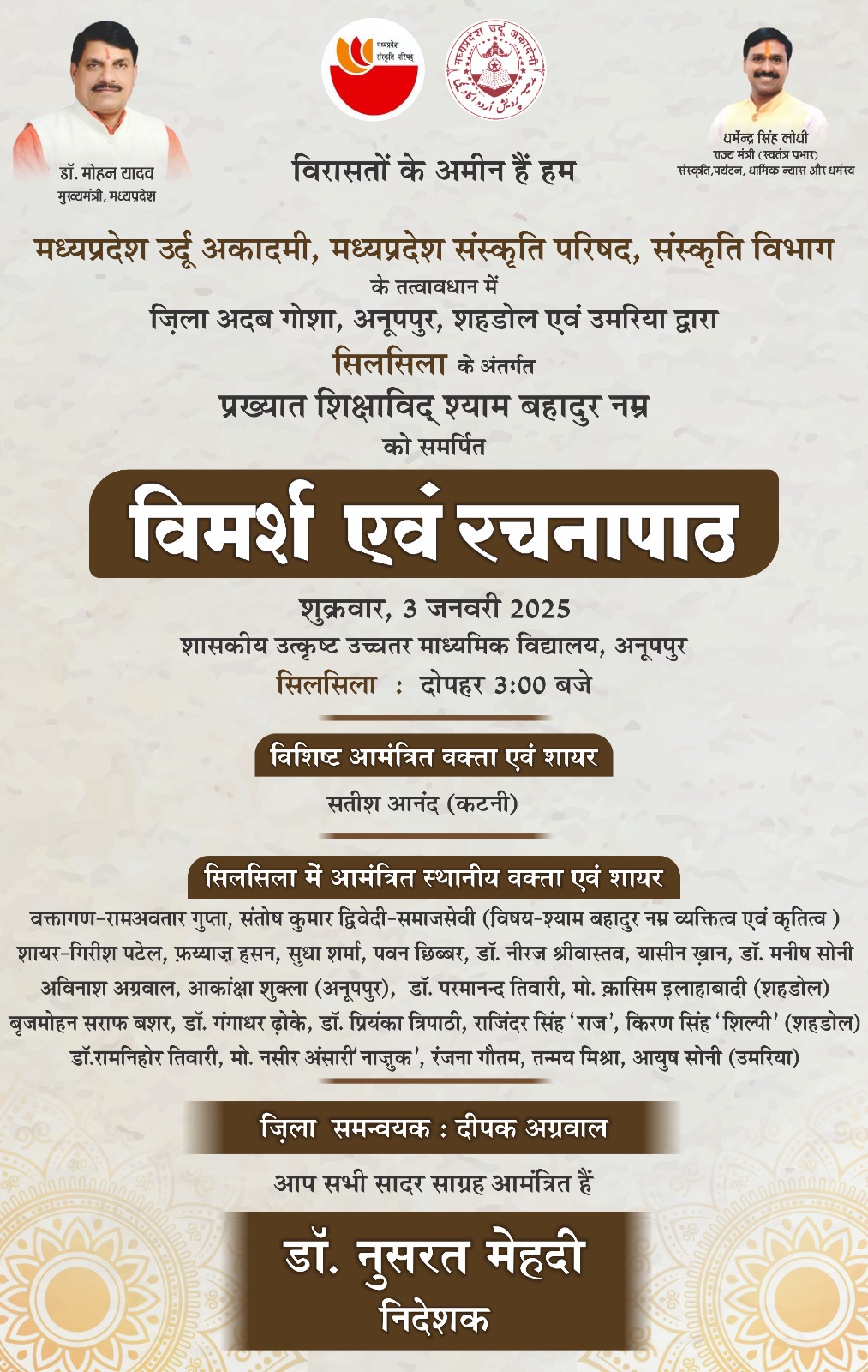 विरासतों के अमीन हैं हम मध्यप्रदेश उर्दू अकादमी, मध्यप्रदेश संस्कृति परिषद, संस्कृति विभाग के तत्वावधान में ज़िला अदब गोशा, अनूपपुर, शहडोल एवं उमरिया द्वारा सिलसिला के अंतर्गत प्रख्यात शिक्षाविद् श्याम बहादुर नम्र को समर्पित विमर्श एवं रचनापाठ शुक्रवार, 3 जनवरी 2025 शासकीय उत्कृष्ट उच्चतर माध्यमिक विद्यालय, अनूपपुर सिलसिला : दोपहर 3:00 बजे विशिष्ट आमंत्रित वक्ता एवं शायर सतीश आनंद (कटनी) सिलसिला में आमंत्रित स्थानीय वक्ता एवं शायर वक्तागण-रामअवतार गुप्ता, संतोष कुमार द्विवेदी-समाजसेवी (विषय-श्याम बहादुर नम्र व्यक्तित्व एवं कृतित्व) शायर-गिरीश पटेल, फ़य्याज़ हसन, सुधा शर्मा, पवन छिब्बर, डॉ. नीरज श्रीवास्तव, यासीन ख़ान, डॉ. मनीष सोनी, अविनाश अग्रवाल, आकांक्षा शुक्ला (अनूपपुर), डॉ. परमानन्द तिवारी, मो. क़ासिम इलाहाबादी (शहडोल) बृजमोहन सराफ़ बशर, डॉ. गंगाधर ढ़ोके, डॉ. प्रियंका त्रिपाठी, राजिंदर सिंह 'राज', किरण सिंह 'शिल्पी' (शहडोल) डॉ. रामनिहोर तिवारी, मो. नसीर अंसारी' नाजुक', रंजना गौतम, तन्मय मिश्रा, आयुष सोनी (उमरिया) जिला समन्वयक : दीपक अग्रवाल आप सभी सादर साग्रह आमंत्रित हैं डॉ. नुसरत मेहदी निदेशक