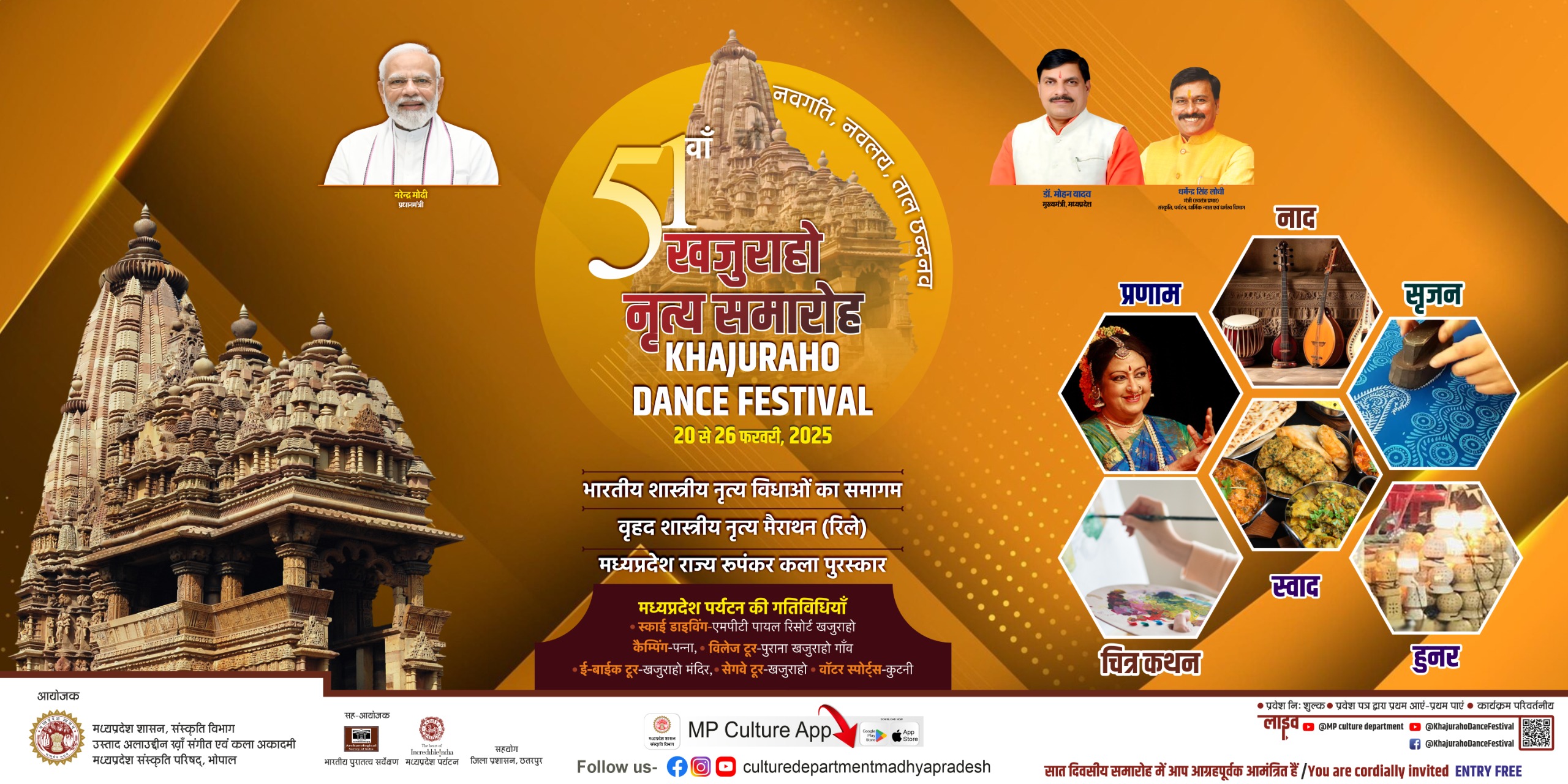 51 वाँ खजुराहो नृत्य समारोह KHAJURAHO DANCE FESTIVAL दिनांक- 20 से 26 फरवरी, 2025 आयोजक - मध्यप्रदेश शासन, संस्कृति विभाग उस्ताद अलाउद्दीन ख़ाँ संगीत एवं कला अकादमी मध्यप्रदेश संस्कृति परिषद्, भोपाल भारतीय शास्त्रीय नृत्य विधाओं का समागम वृहद शास्त्रीय नृत्य मैराथन (रिले) मध्यप्रदेश राज्य रूपंकर कला पुरस्कार कलाकारों के बारे में जानने हेतु आप हमसे जुड़े रहें। पहले आयें पहले पाएं सात दिवसीय समारोह में आप आग्रहपूर्वक आमंत्रित हैं / You are cordially invited ENTRY FREE