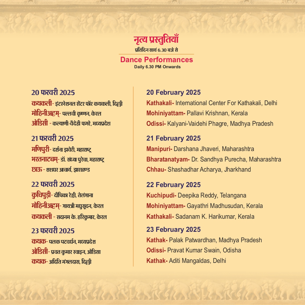 51st खजुराहो नृत्य समारोह KHAJURAHO DANCE FESTIVAL 20 से 26 फरवरी 2025 प्रतिदिन सायं 6.30 बजे से स्थान- मंदिर प्रांगण, खजुराहो नृत्य प्रस्तुतियाँ 20 फरवरी 2025, सायं 6.30 बजे कथकली - इंटरनेशनल सेंटर फॉर कथकली, दिल्ली मोहिनीअट्टम् - पल्लवी कृष्णन, केरल ओडिसी - कल्याणी - वैदेही फगरे, मध्यप्रदेश