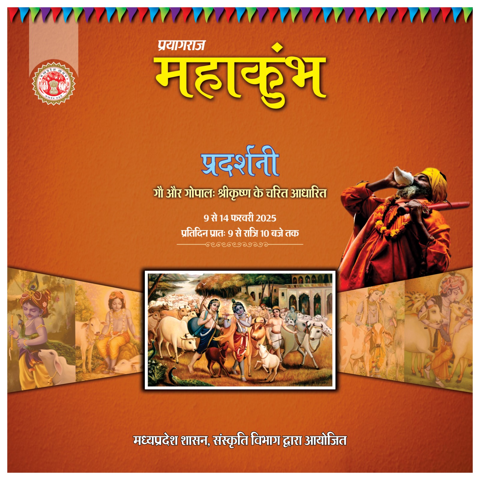 प्रयागराज महाकुंभ प्रदर्शनियाँ प्रतिदिन प्रातः 9 से रात्रि 10 बजे तक मध्यप्रदेश मण्डप, सेक्टर-7, कैलाश पुरी मार्ग, पूर्वी पटरी, प्रयागराज मध्यप्रदेश शासन, संस्कृति विभाग द्वारा आयोजित