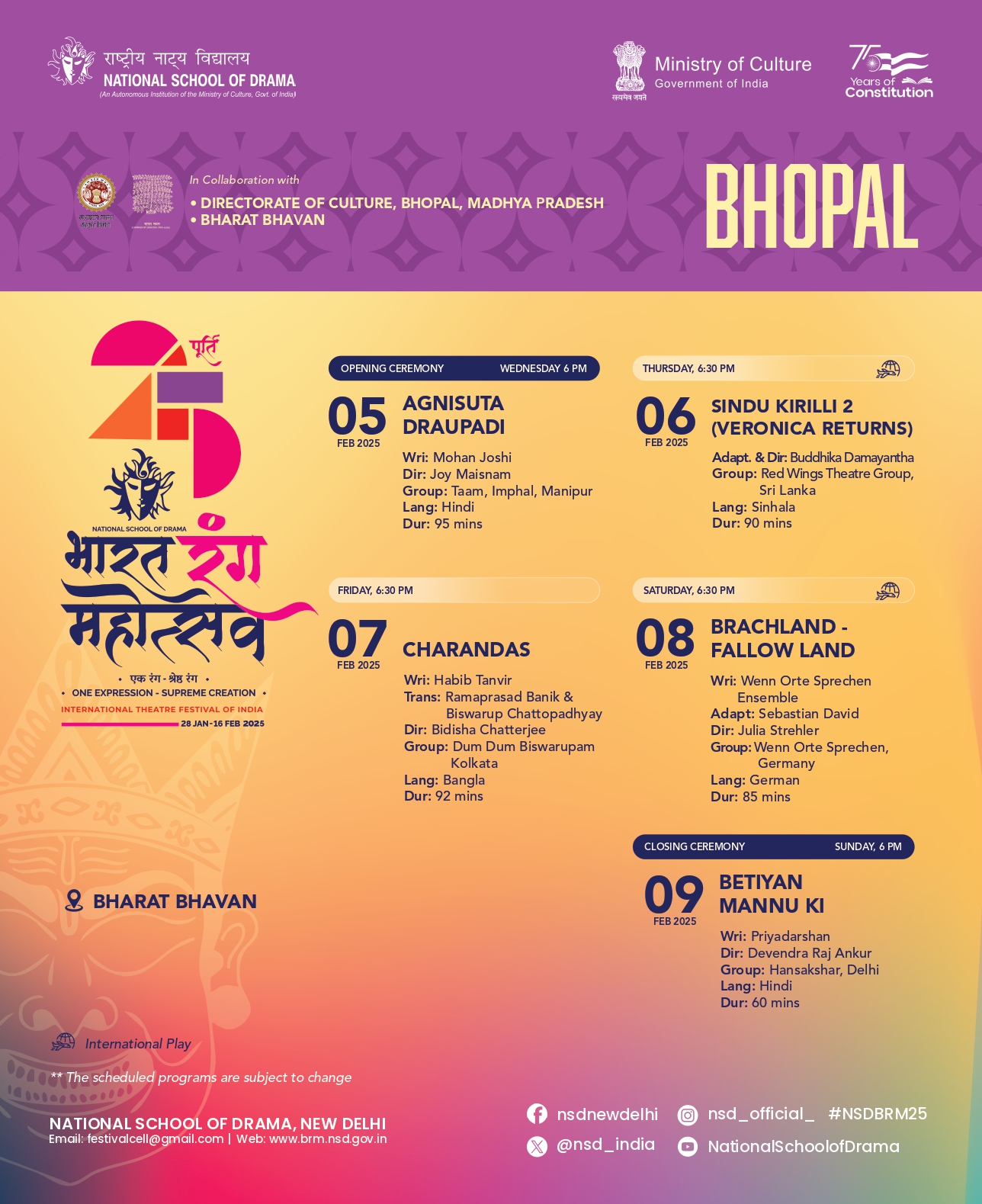 भारत रंग महोत्सव 05-09 Feb 2025 Timing-6:30 PM , Place- Bharat Bhawan, Bhopal 05 FEB 2025 AGNISUTA DRAUPADI Wri: Mohan Joshi Dir: Joy Maisnam Group: Taam, Imphal, Manipur Lang: Hindi Dur: 95 mins 06-FEB 2025 SINDU KIRILLI 2 (VERONICA RETURNS) Adapt. & Dir: Buddhika Damayantha Group: Red Wings Theatre Group, Sri Lanka Lang: Sinhala Dur: 90 mins 07 Feb 2025 CHARANDAS Wri: Habib Tanvir Trans: Ramaprasad Banik & Biswarup Chattopadhyay Dir: Bidisha Chatterjee Group: Dum Dum Biswarupam Kolkata Lang: Bangla Dur: 92 mins SATURDAY, 6:30 PM 08 FEB 2025 BRACHLAND - FALLOW LAND Wri: Wenn Orte Sprechen Ensemble Adapt: Sebastian David Dir: Julia Strehler Group: Wenn Orte Sprechen, Germany Lang: German Dur: 85 min 09FEB 2025 BETIYAN MANNU KI Wri: Priyadarshan SUNDAY, 6 PM Dir: Devendra Raj Ankur Group: Hansakshar, Delhi Lang: Hindi Dur: 60 mins