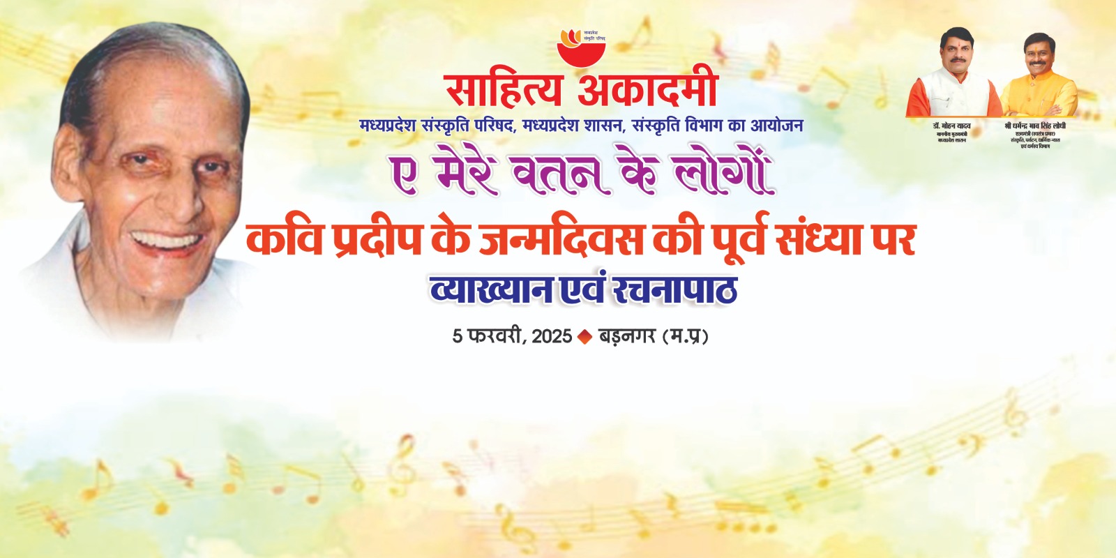 साहित्य अकादमी, मध्यप्रदेश संस्कृति परिषद्, मध्यप्रदेश शासन संस्कृति विभाग भोपाल द्वारा कवि प्रदीप के जन्मपदिवस की पूर्व संध्या पर दिनांक 5 फरवरी, 2025 को सायं 7.00 बजे से सरस्व ती शिशु मंदिर, बदनावर मार्ग, बड़नगर (म.प्र.) में व्याख्यान एवं रचनापाठ आयोजित है। कार्यक्रम के प्रथम सत्र के मुख्य अतिथि श्री जितेन्द्र उदयसिंह पंडया-विधायक बड़नगर होंगे। व्याख्यान श्री नीतेश जोशी-बड़नगर देंगे। कार्यक्रम के दूसरे सत्र में नरेन्द्र नखेत्री-कायथा, नरेन्द्र सिंह अकेला-उज्जैन, मुकेश मासूम-खातेगांव, सुनील गाइड-तराना, राहुल शर्मा-उज्जैन, महेन्द्र सिंह पंवार-धरमपुरी, प्रद्युम्न शर्मा-इंदौर, अपूर्वा चतुर्वेदी-सतना एवं संगीता नाग-उज्जैन अपनी-अपनी रचनाओं का पाठ करेंगे। कार्यक्रम के स्थानीय संयोजक चेतनपुरी गोस्वामी होंगे। आयोजित व्याख्यान एवं रचनापाठ में आप सभी सादर साग्रह आमंत्रित हैं। डॉ. विकास दवे निदेशक साहित्य अकादमी, भोपाल