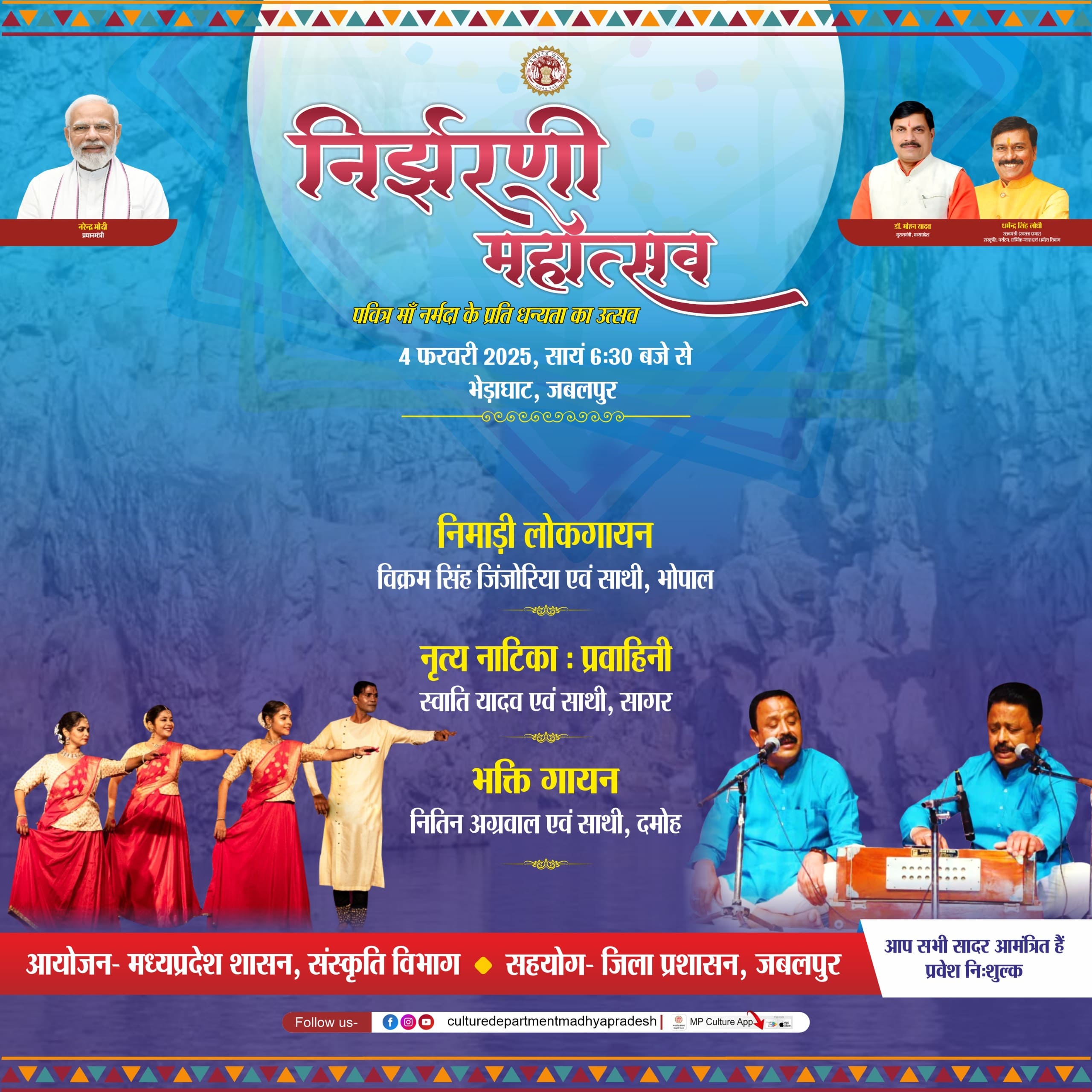 निर्झरणी महोत्सव 4 फरवरी 2025, सायं 6:30 बजे से भेड़ाघाट, जबलपुर निमाड़ी लोकगायन विक्रम सिंह जिंजोरिया एवं साथी, भोपाल नृत्य नाटिका : प्रवाहिनी स्वाति यादव एवं साथी, सागर भक्ति गायन नितिन अग्रवाल एवं साथी, दमोह आयोजन - मध्यप्रदेश शासन, संस्कृति विभाग • सहयोग - जिला प्रशासन, जबलपुर -आप सभी सादर आमंत्रित हैं प्रवेश निःशुल्क