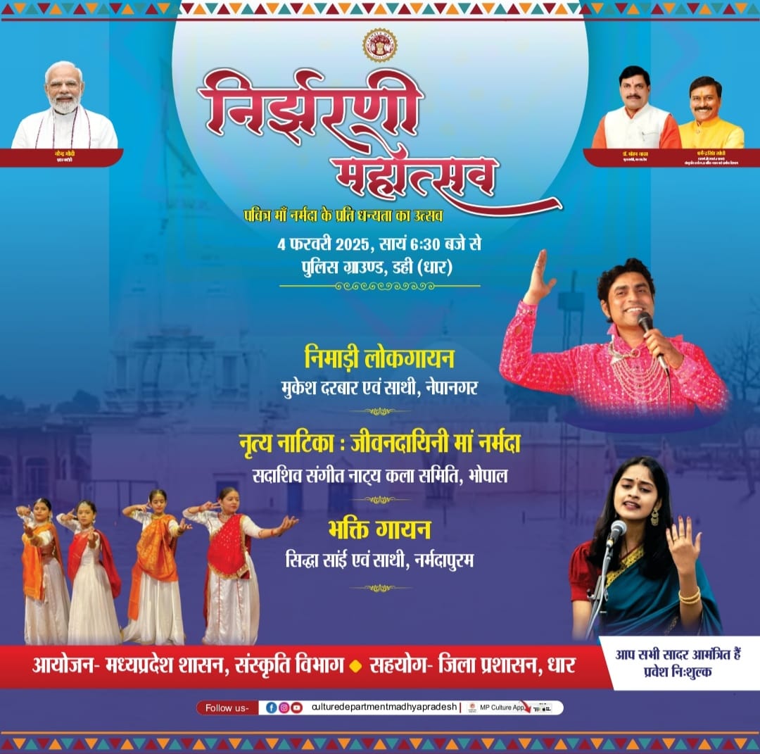 निर्झरणी महोत्सव पवित्र माँ नर्मदा के प्रति धन्यता का उत्सव 4 फरवरी 2025, सायं 6:30 बजे से पुलिस ग्राउण्ड, डही (धार) निमाड़ी लोकगायन- मुकेश दरबार एवं साथी, नेपानगर नृत्य नाटिका : जीवनदायिनी मां नर्मदा सदाशिव संगीत नाट्य कला समिति, भोपाल भक्ति गायन सिद्धा सांई एवं साथी, नर्मदापुरम आयोजन - मध्यप्रदेश शासन, संस्कृति विभाग • सहयोग - जिला प्रशासन, धार आप सभी सादर आमंत्रित हैं प्रवेश निःशुल्क
