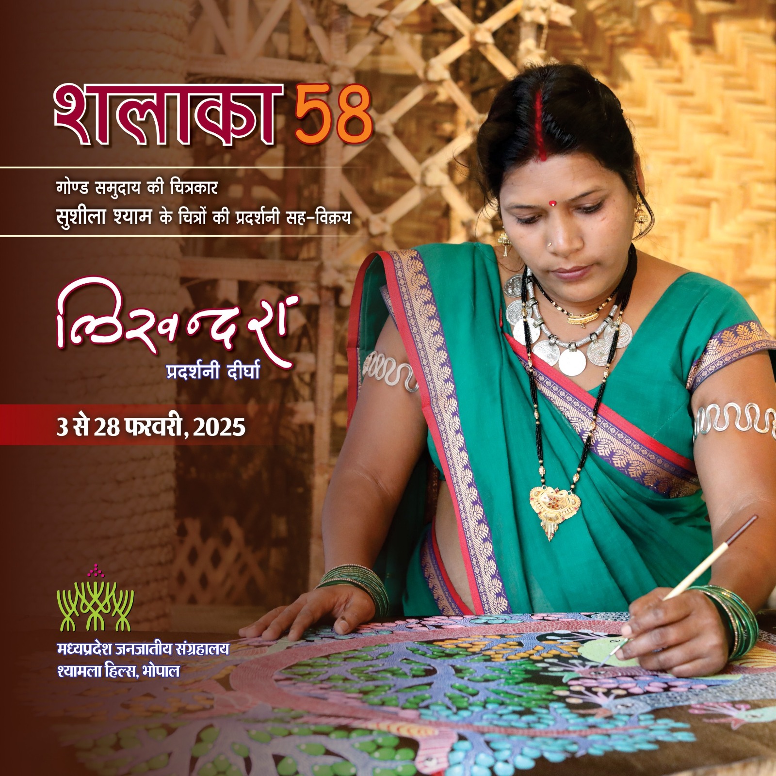 शलाका 58 गोण्ड समुदाय की चित्रकार सुशीला श्याम के चित्रों की प्रदर्शनी सह-विक्रय प्रदर्शनी दीर्घा 3 से 28 फरवरी, 2025 मध्यप्रदेश जनजातीय संग्रहालय श्यामला हिल्स, भोपाल
